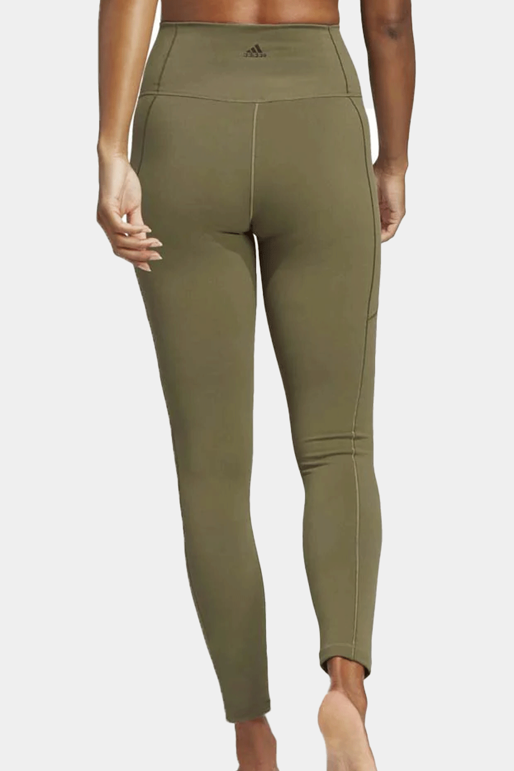 These Adidas high-rise tights in Olive Green offer a snug, 7/8-length fit for maximum support. Made with moisture-wicking AEROREADY fabric, they keep you dry during workouts. Crafted from 79% recycled polyester and 21% elastane, they combine comfort, sustainability, and performance.