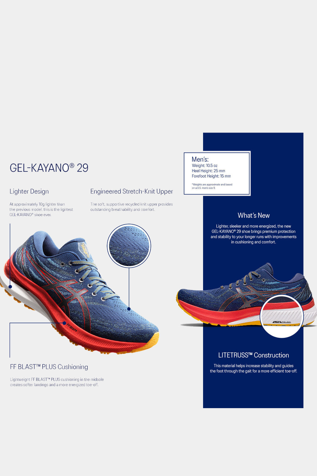 The Asics Gel Kayano 29 running shoes offer a steady and reactive run thanks to a low-profile heel counter that supports the rearfoot. The midsole has been upgraded with FF BLAST‚Ñ¢ PLUS cushioning for a lightweight yet energized step, and the LITETRUSS‚Ñ¢ stability feature on the inside angle of the midsole prevents excessive inward rolling during your stride.