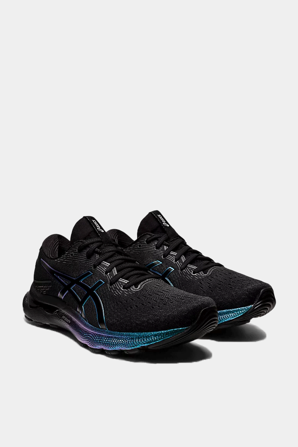 The GEL-NIMBUS 24 PLATINUM delivers lightweight comfort and advanced impact protection for long-distance runs. Featuring silver accents and an iridescent midsole, its soft mesh upper and flexible midfoot panel ensure a smooth stride. FF BLAST PLUS cushioning enhances shock absorption and provides a more responsive toe-off.