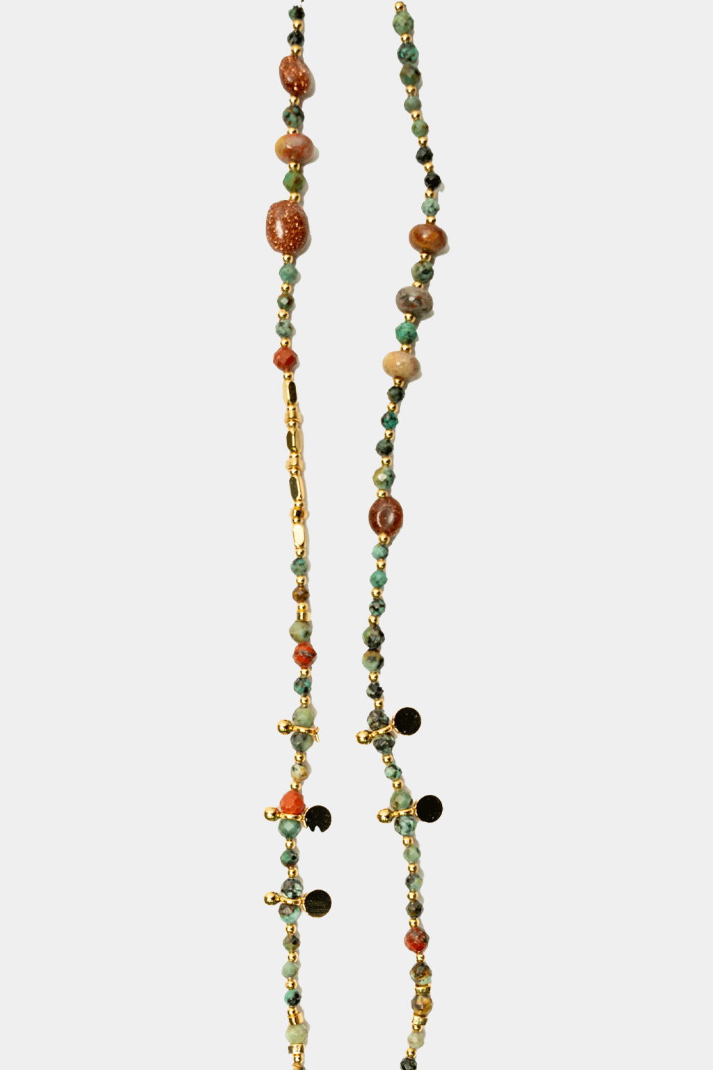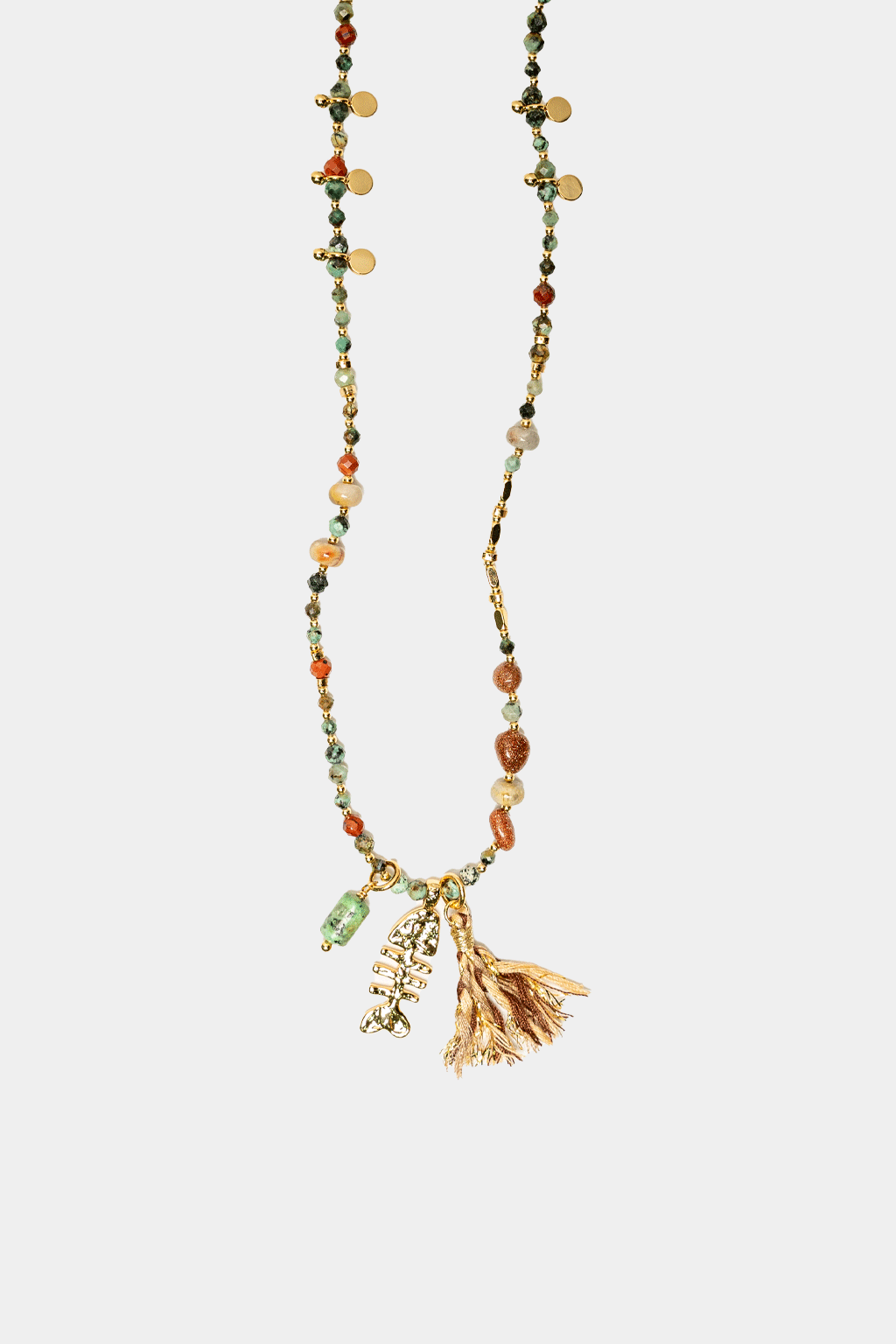 Elevate your jewelry collection with this stunning beaded necklace featuring a delicate gold-tone fish skeleton charm. Crafted with natural stone beads, this piece combines organic elegance with contemporary design. The intricate fish skeleton pendant adds a unique focal point, making it perfect for layering or wearing solo. Ideal for those who appreciate meaningful, nature-inspired accessories that blend sophistication with artistic flair. A versatile statement piece that complements both casual and refined styles.