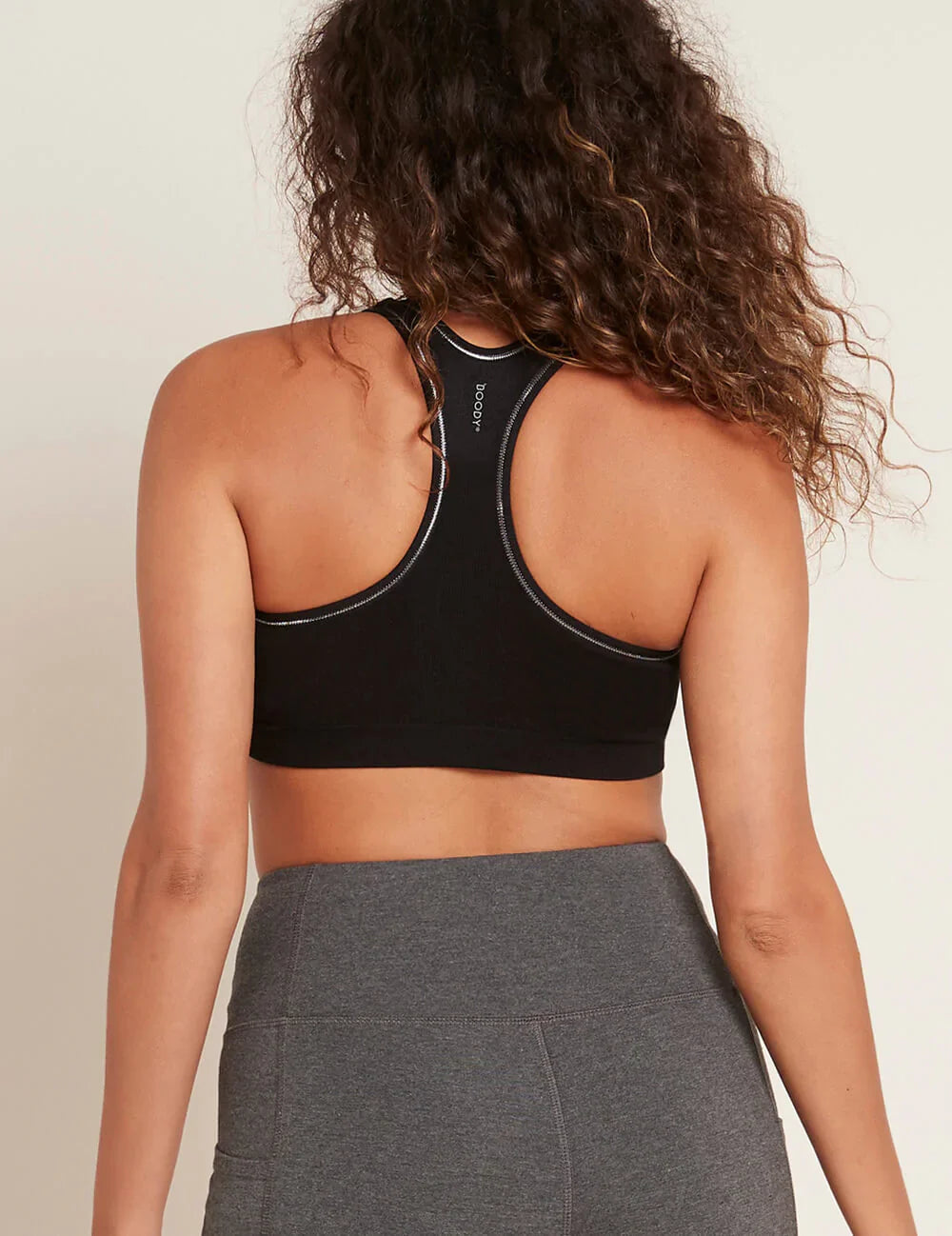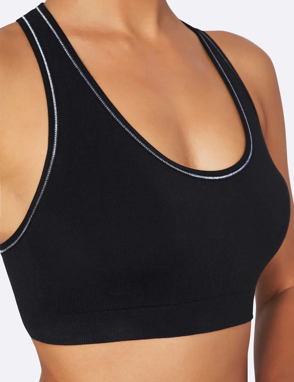 This sports bra is a basic must-have for any active wardrobe. Intended to provide medium, everyday support it's perfect for gym workouts, yoga sessions and active weekends. The racer-back shape, wide straps and underbust ribbing deliver ultimate comfort while the round neckline provides extra coverage. Available with a black or silver overstitch for an understated fashion statement under your tops. Back pattern matches with our Women's Racerback Tank.