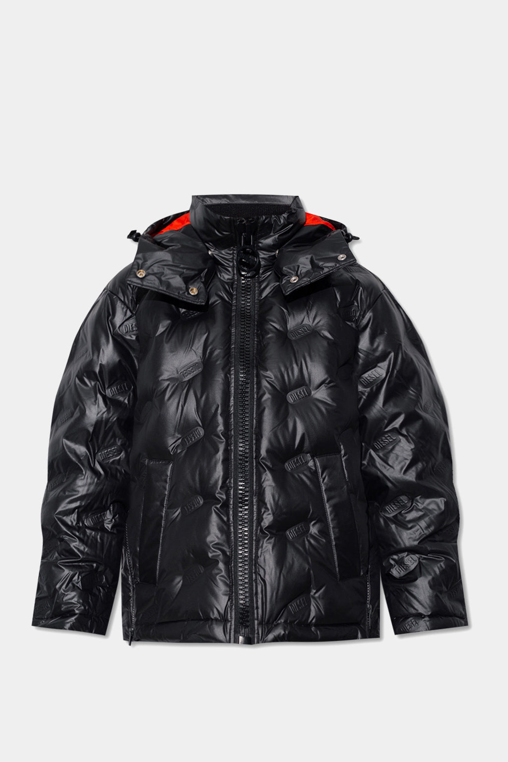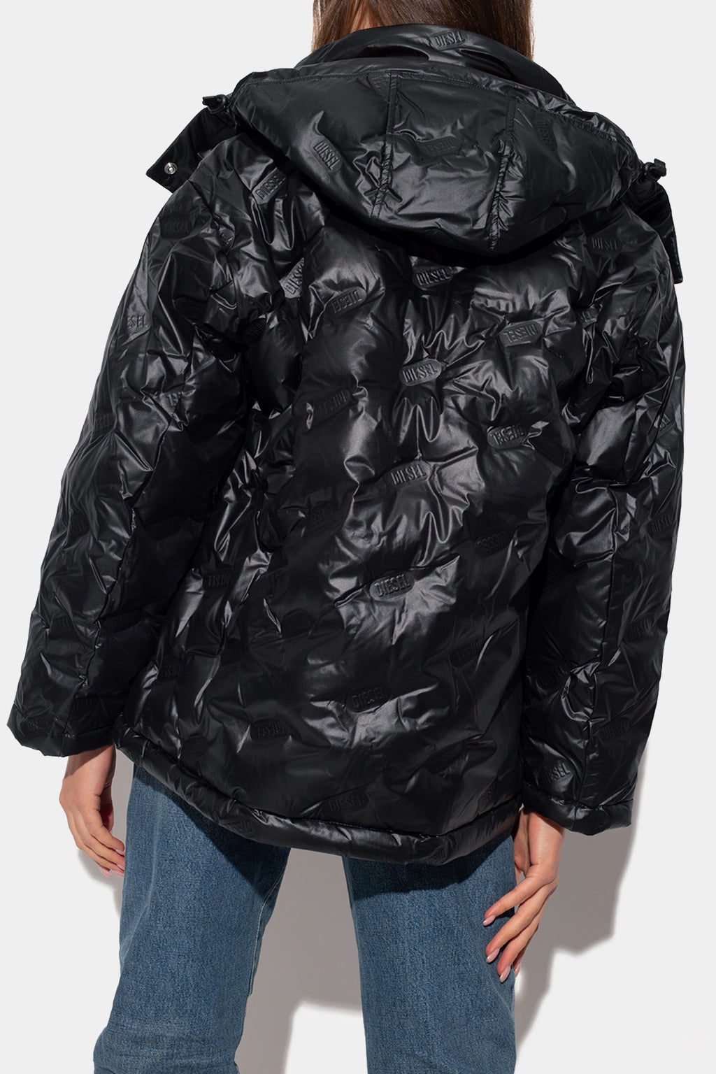 This timeless black jacket from Diesel is the perfect blend of style and comfort. Crafted with a zip closure and a drawstring hood, it features a logo pattern and two slip pockets along with decorative zips at the hem, making it a luxurious and versatile addition to any wardrobe.