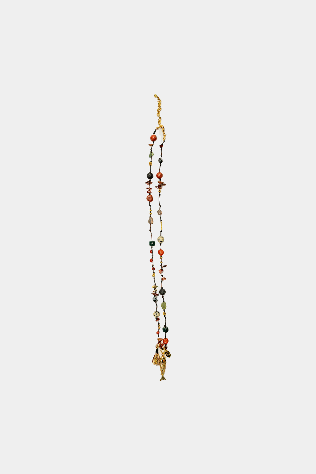 This handmade beaded necklace features a mix of semi-precious stones, a gold-toned fish charm, and a playful tassel, creating a unique accessory with an artisanal touch.