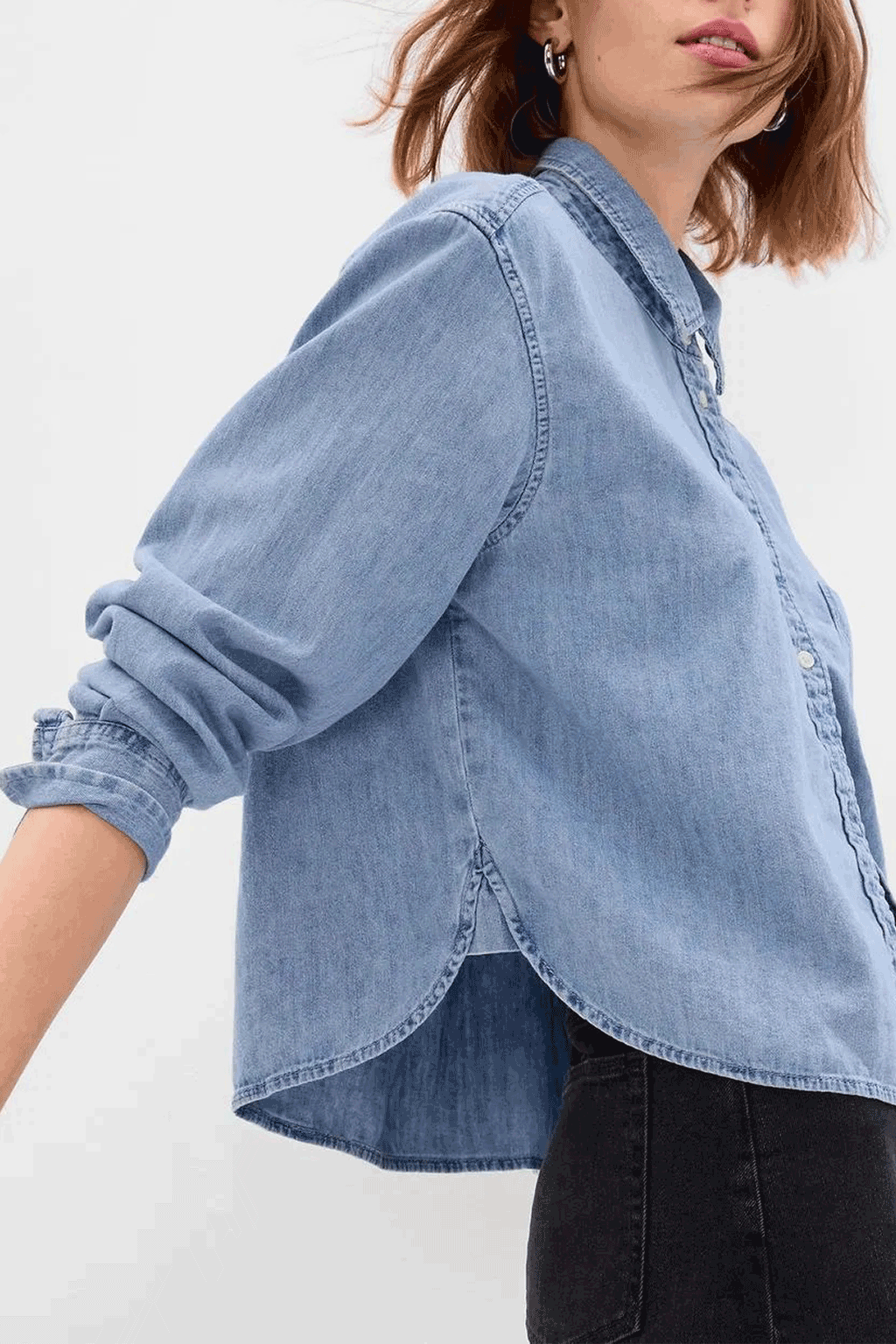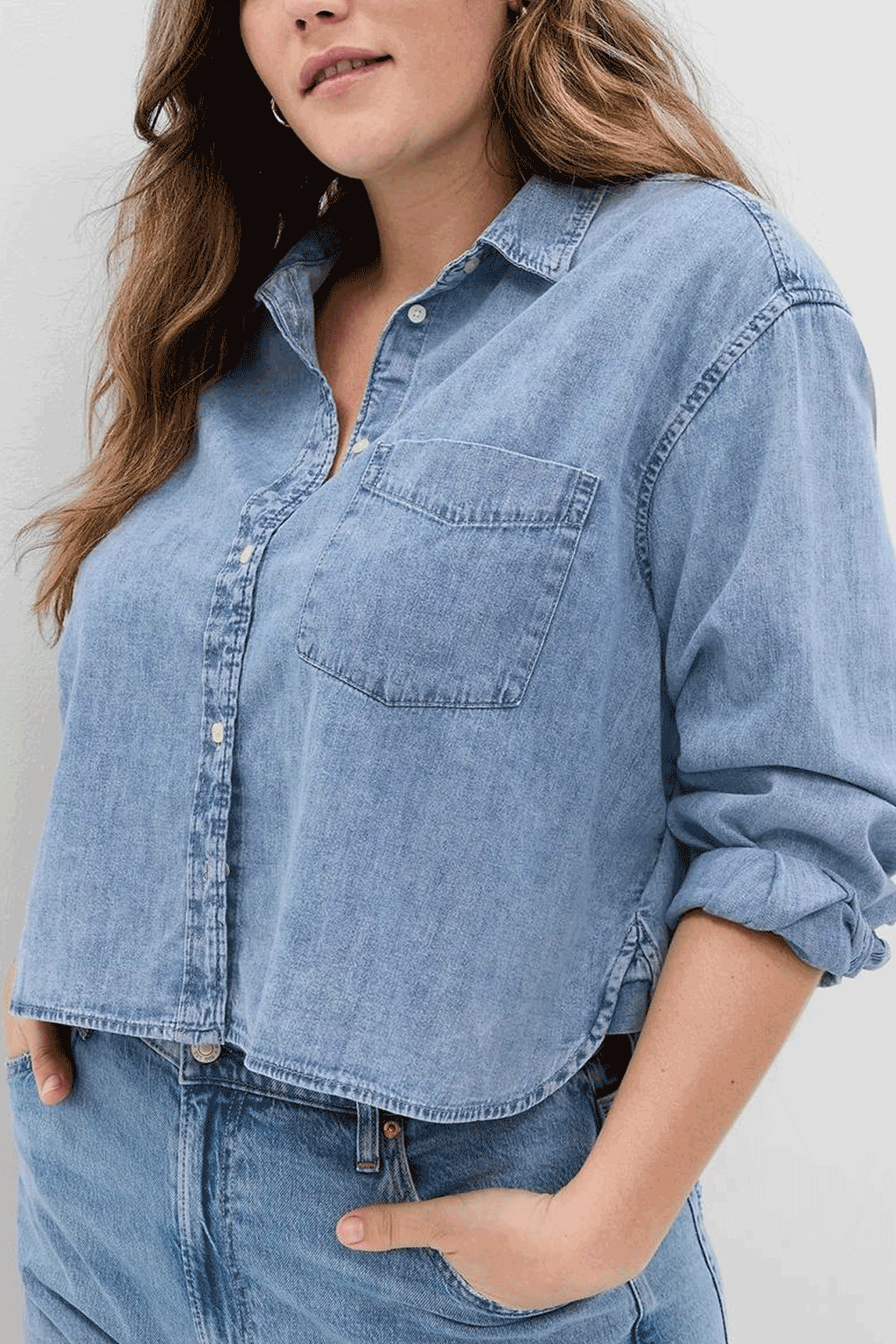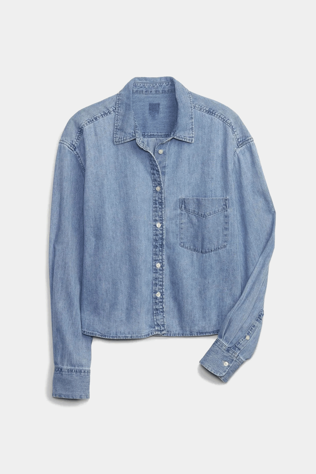 Upgrade your wardrobe with the Gap Denim Crop Shirt, a timeless piece featuring a relaxed fit and authentic non-stretch denim. This classic crop shirt offers versatility with a pointed collar, buttoned front, and long sleeves with buttoned cuffs. The front pocket detail adds functionality, while the high-quality fabric ensures comfort and durability. Perfect for any season, this denim shirt effortlessly combines style and practicality.