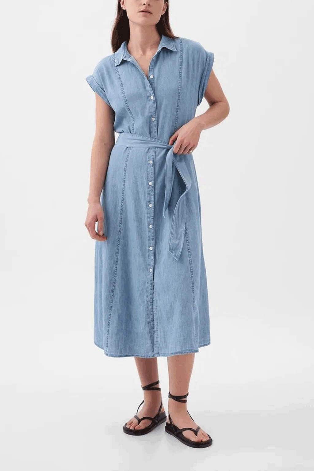 Elevate your style with Gap's Denim Midi Dress, featuring a classic button-down collar and short sleeves for a timeless summer look. This dress hugs your figure with a lace-detail waist and button front. Crafted with our eco-friendly Washwell program, it uses 20% less water, offering a sustainable yet stylish option. Choose this dress for a blend of comfort, elegance, and environmental consciousness.