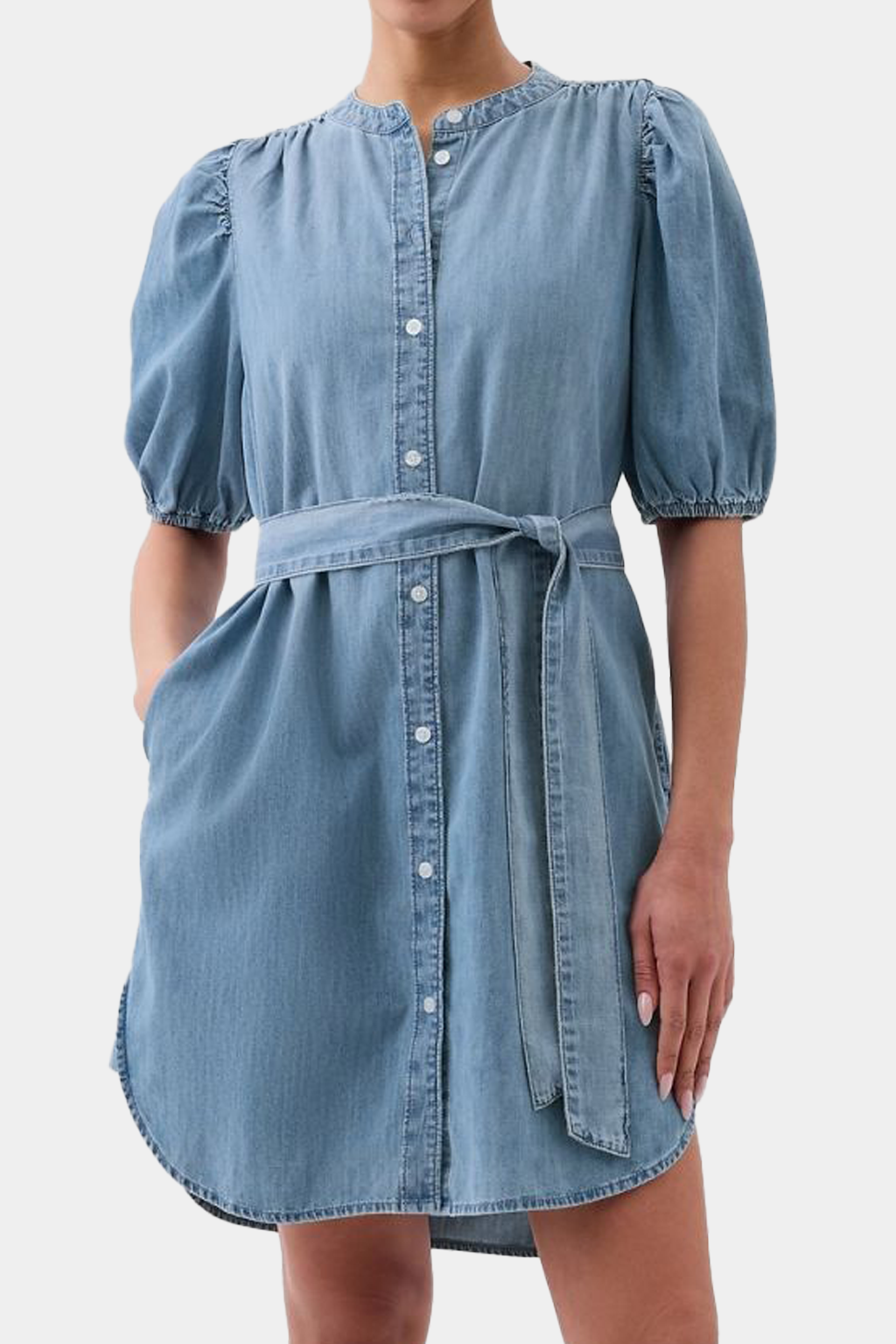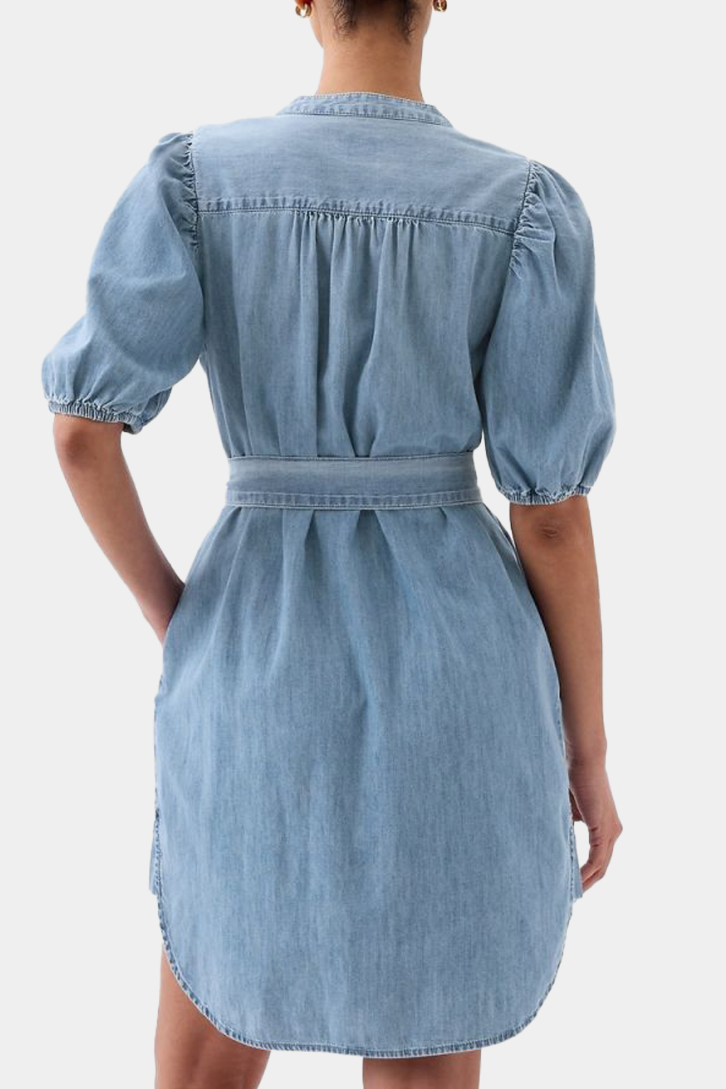 Turn heads with effortless charm in the GAP Puff-Sleeve Denim Mini Dress, crafted in a soft, light wash indigo for a vintage-inspired yet modern look. Featuring statement puff sleeves and a flattering mini silhouette, this dress is perfect for everything from casual brunch dates to laid-back weekend outings.