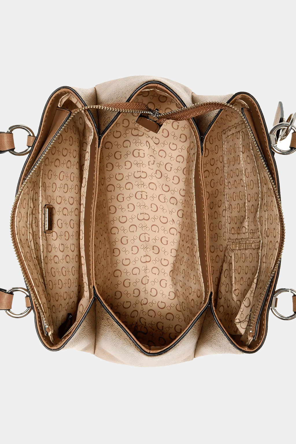 Elevate your everyday style with this sophisticated Guess handbag, designed in a structured trapezoid silhouette. Featuring dual top handles and a detachable shoulder strap, it offers versatile styling for both casual and formal occasions.