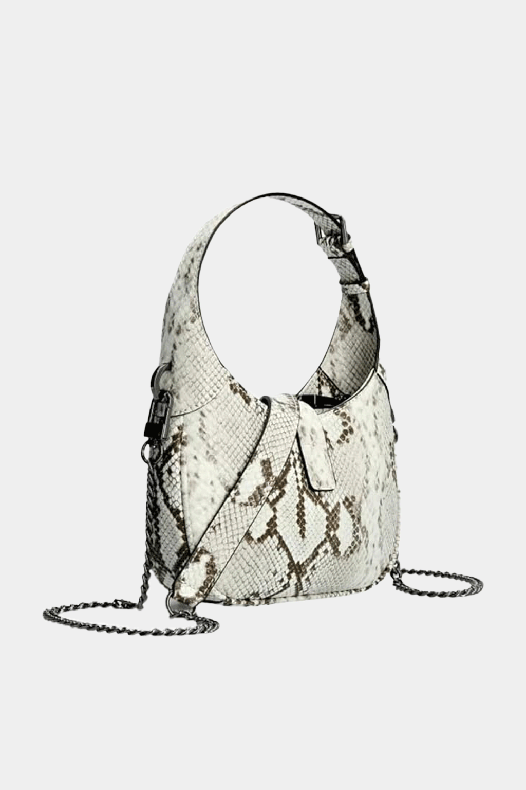 Make a bold statement with this Guess shoulder bag, featuring a chic white and brown snakeskin pattern. Designed with a structured crescent silhouette, it offers both elegance and edge. The bag is styled with a sleek top handle and an optional chain strap for versatile crossbody wear.