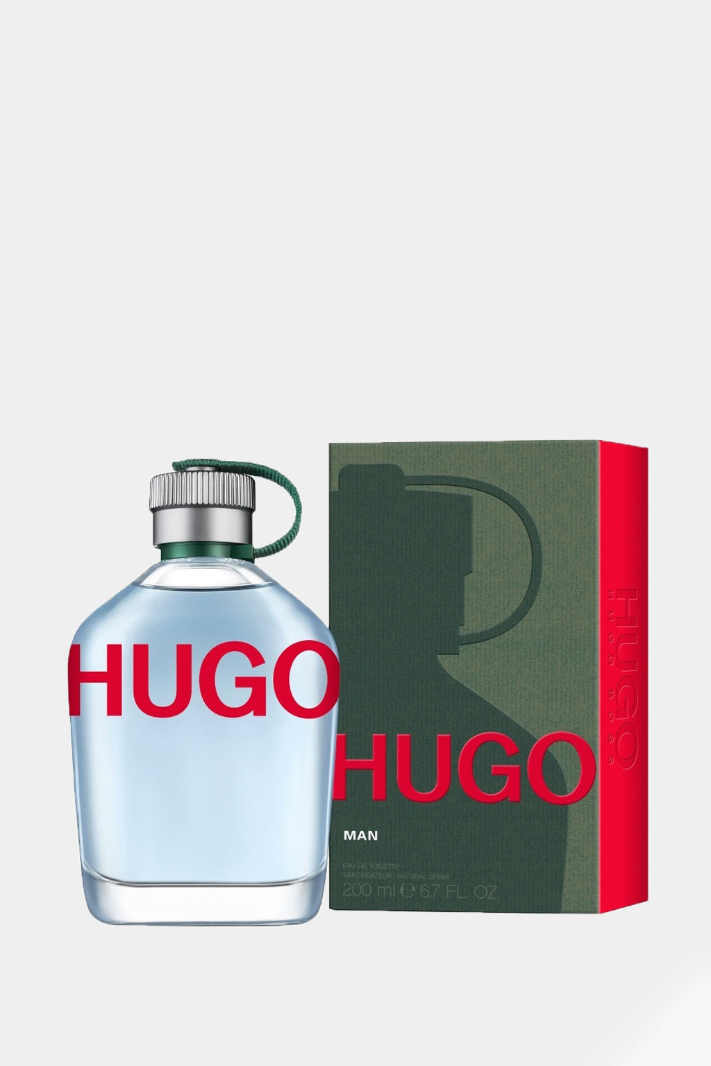 A bottle of HUGO Man eau de toilette. This modern fragrance is an energising hit of crisp green apple combined with smoky fir balsam and vibrant aromatic notes. Ideal for those with a free-spirited nature, HUGO Man is presented in a sleek flask with a bold logo.