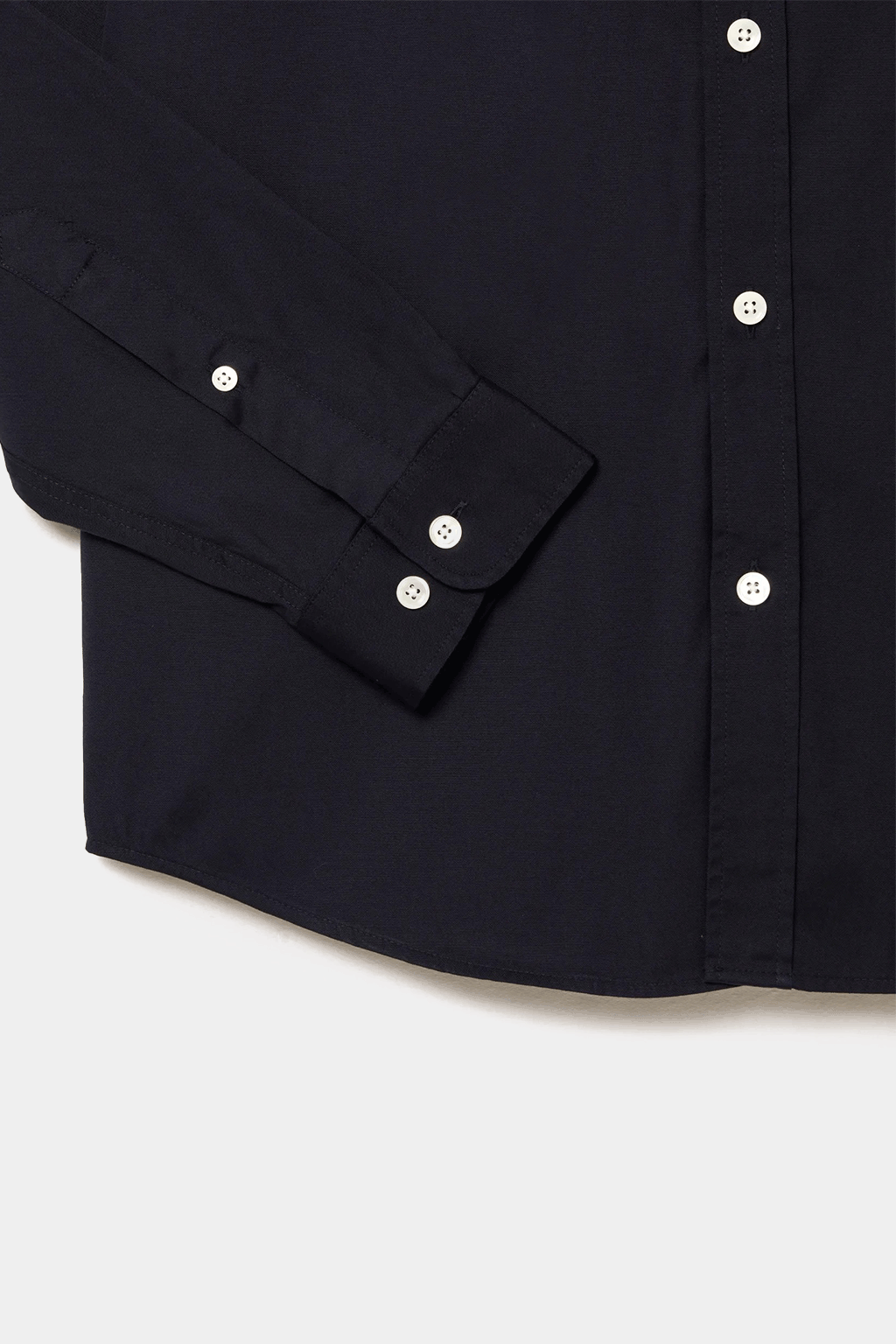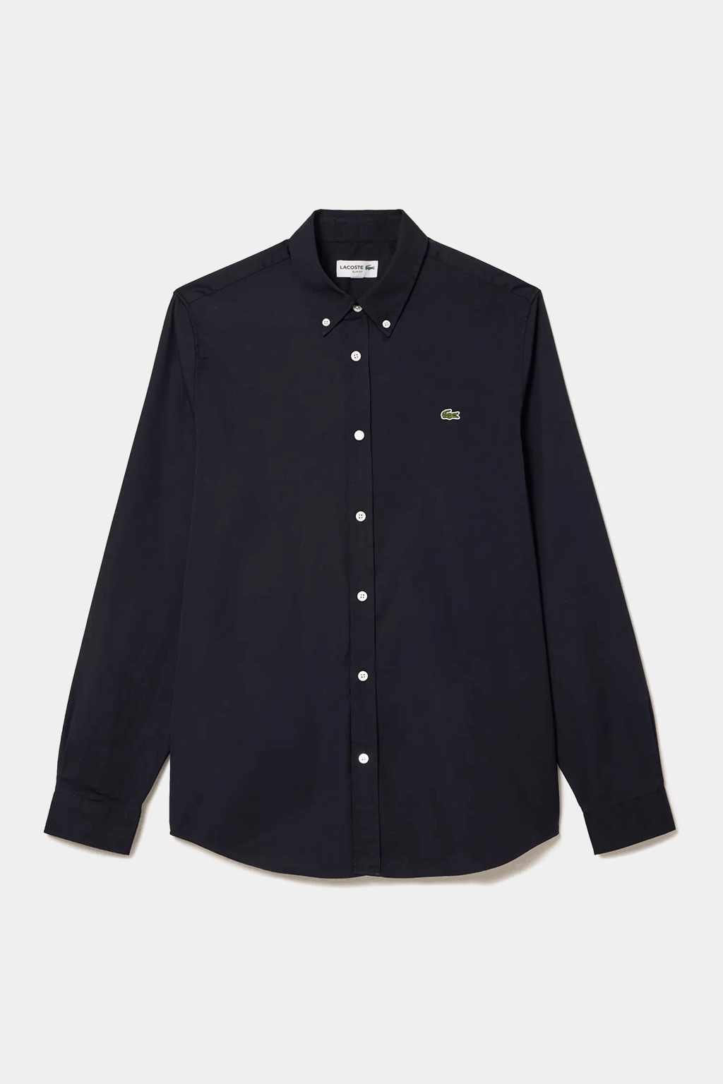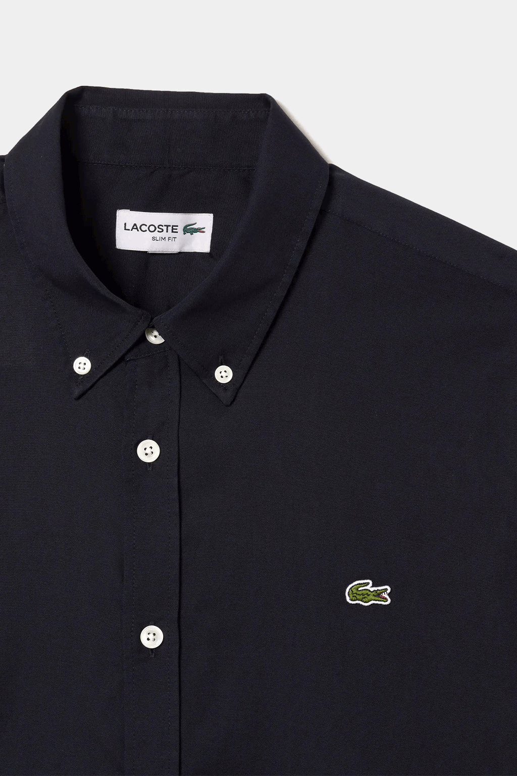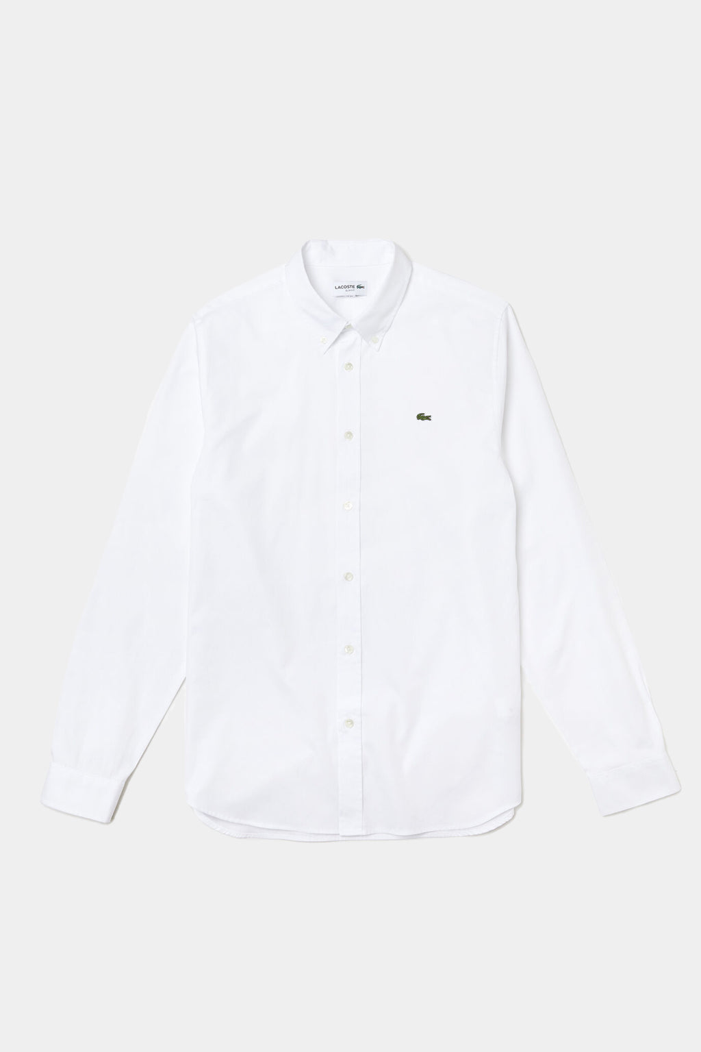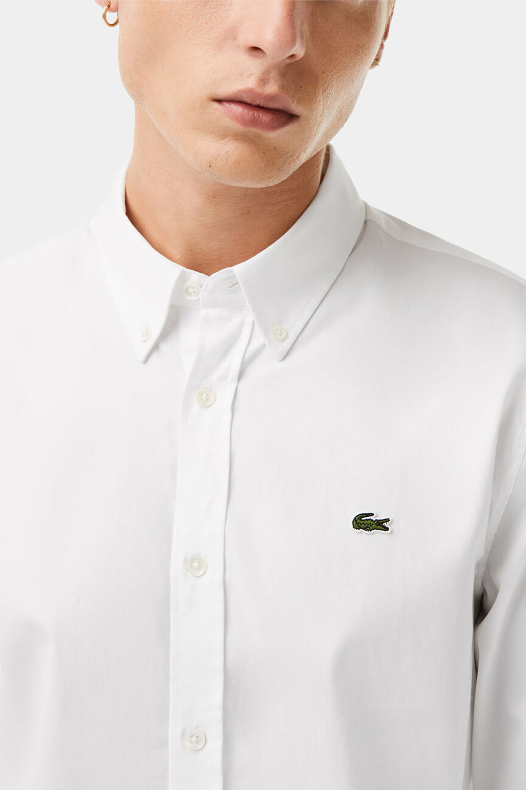 Cotton pinpoint with a texture evoking both iconic poplin and premium Oxford cotton: that‚ as what this elegant shirt is made of. Topped with a buttoned shirt collar and authentic mother-of-pearl buttons, it features a small badge green crocodile on the chest. Keep it elegant when you tuck this slim-fit piece into striped cotton suit pants.