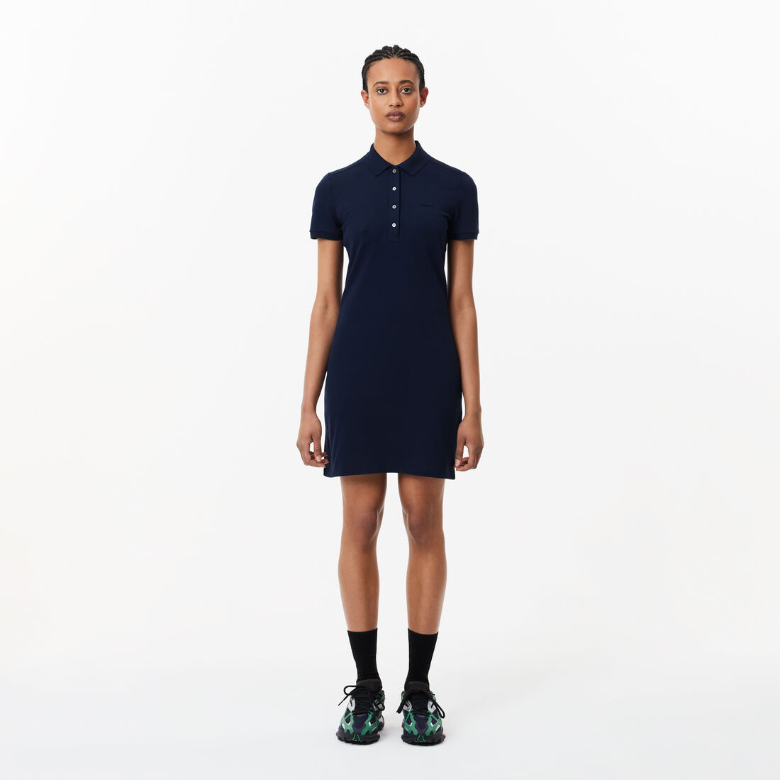 A modern icon, the Slim Fit Stretch Petit Pique Polo Dress blends Lacoste's signature athletic heritage with refined femininity. Crafted from soft stretch cotton pique, it flatters the figure with a sleek silhouette and offers all-day comfort. Finished with a ribbed collar, buttoned placket, and tonal crocodile, it‚ as a timeless piece for effortless style.