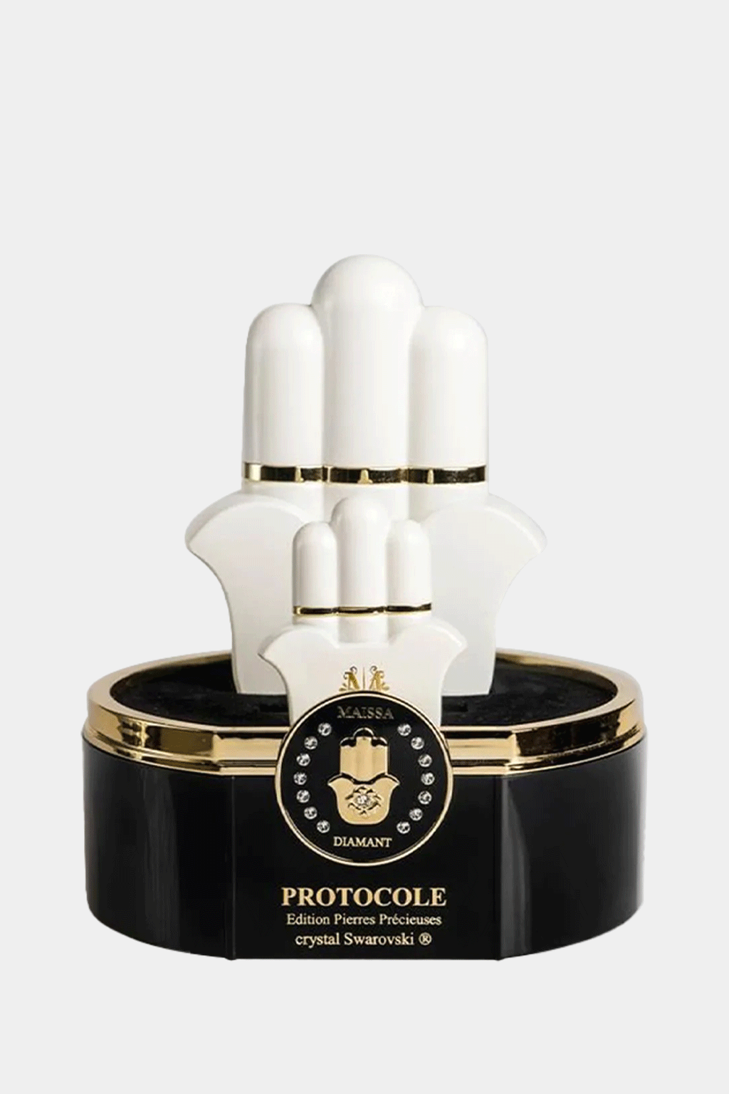 Experience the perfection of Maissa - Protocole Set. Each box contains a unique character, enhanced by sublime eternity diamonds. Let the elegant and chic fragrance envelop you with spicy and herbal notes, while the intoxicating scent of patchouli, Bulgarian rose, and vanilla express their nobility on every skin.