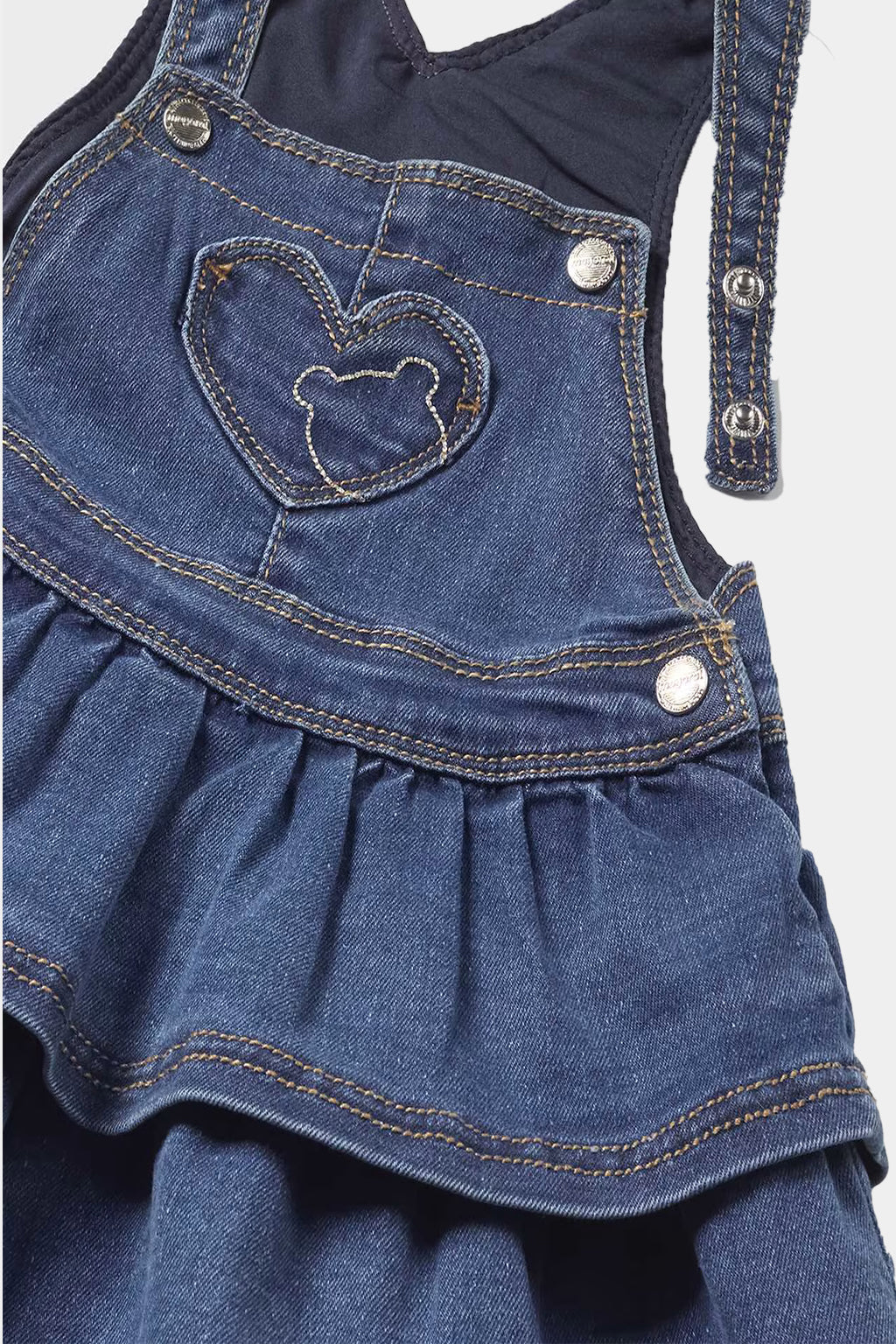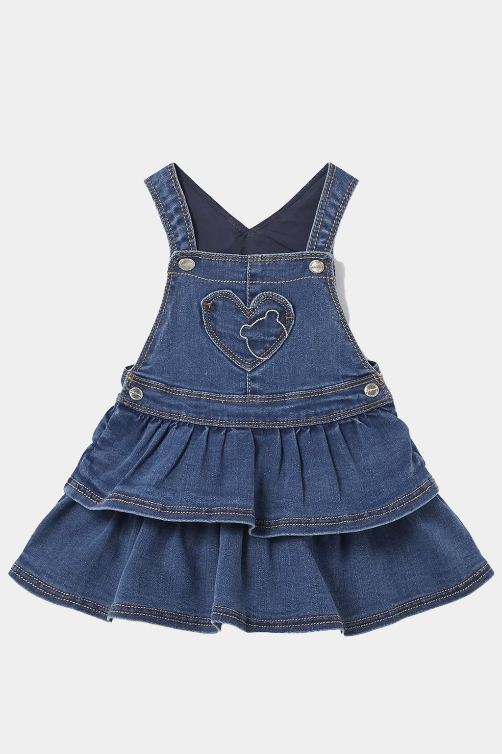 Introducing our Mayoral Baby Denim Dungaree Skirt, a stylish and comfortable addition to any baby's wardrobe. Made with a blend of high-quality cotton, polyester, and elastane materials, this skirt offers a soft and stretchy fit for all-day wear. Also featuring a durable 100% polyester lining.