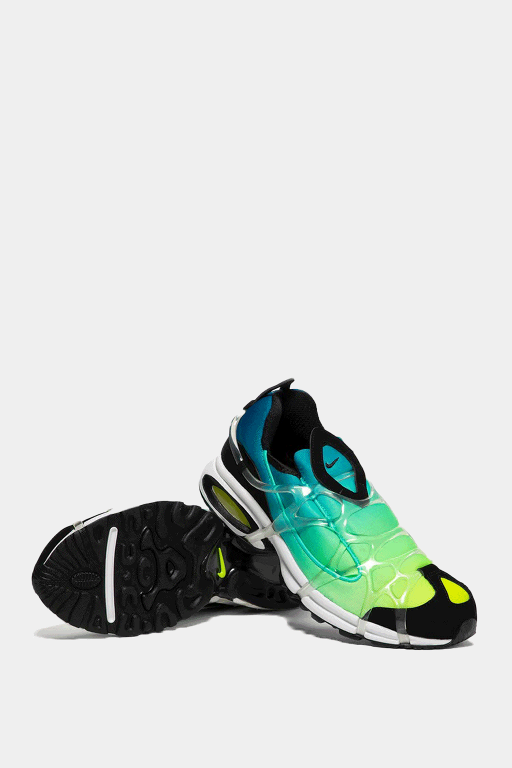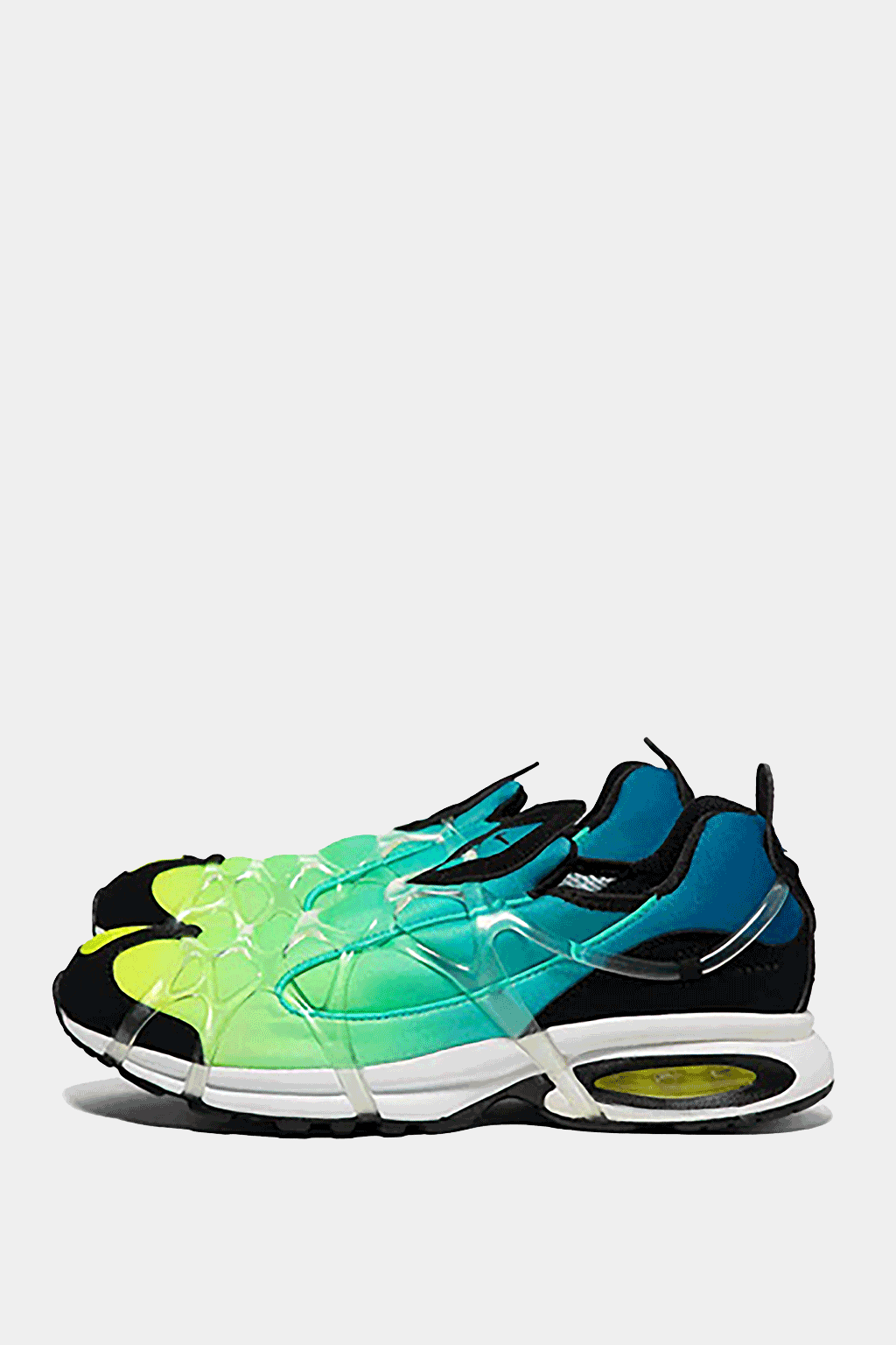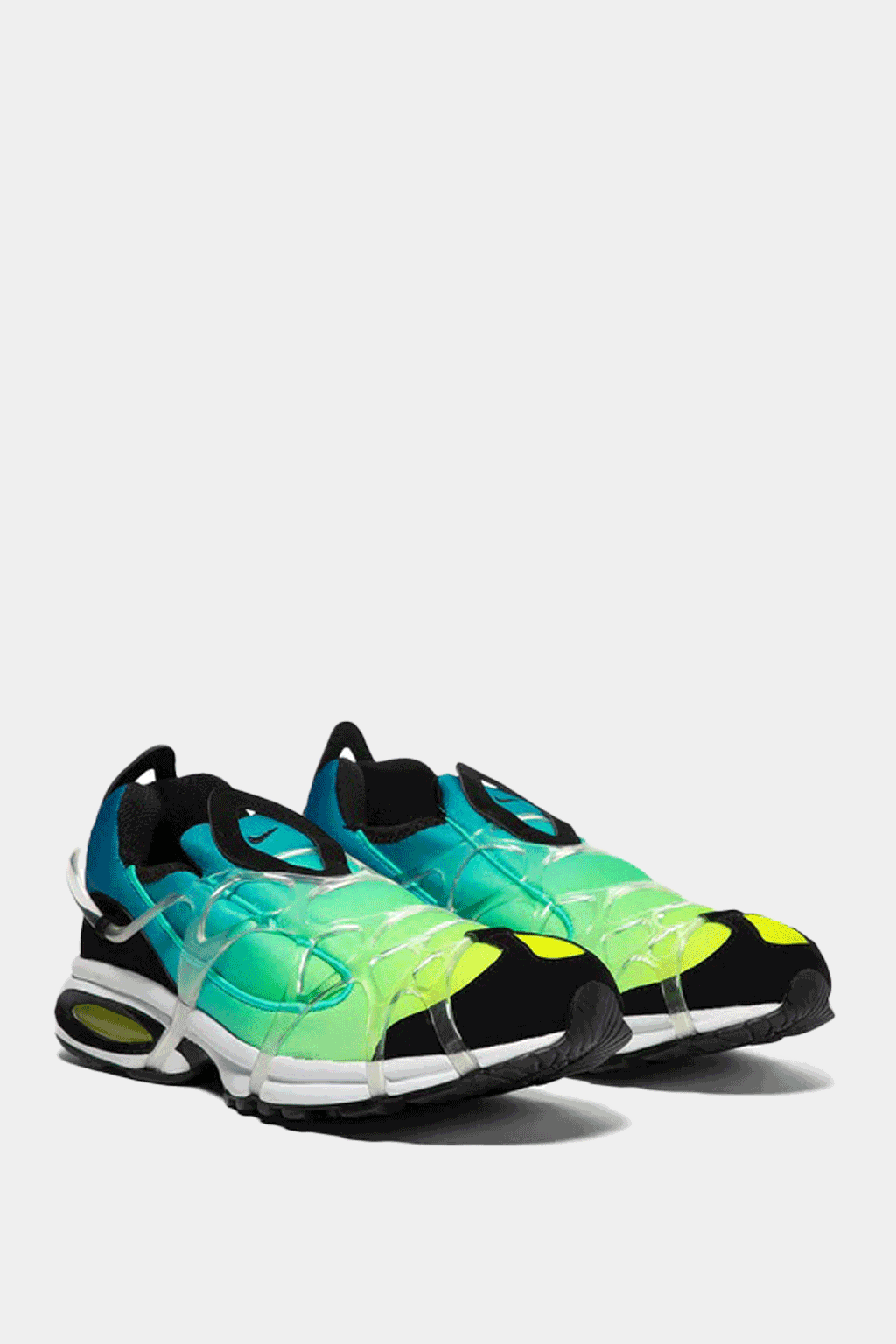 A white slip-on sneaker with a metallic silver print, a clear webbed cage over the upper, a white foam midsole with visible Air cushioning, and a matching rubber outsole. Clean and futuristic look for casual wear.