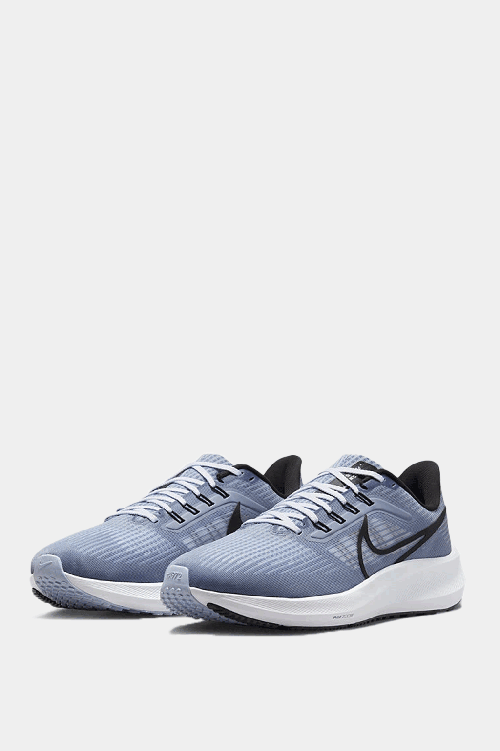 A sleek, cushioned men's running shoe featuring an ashen slate grey mesh upper with cobalt-blue and football-grey accents. The updated design includes lightweight Flywire cables for midfoot support and dual Zoom Air units in the forefoot and heel for snappy responsiveness. A thick React foam midsole ensures smooth, protected strides while the waffle-inspired rubber outsole delivers reliable traction for everyday road runs.