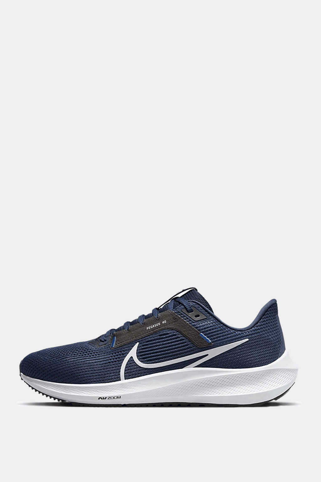 This sleek iteration of the Pegasus 40 features a deep Midnight Navy engineered mesh upper with black overlays and a crisp white Swoosh. Its streamlined profile rests on a thick React foam midsole with dual Zoom Air units, delivering a performance-ready yet clean aesthetic‚ ideal for both running and daily wear.