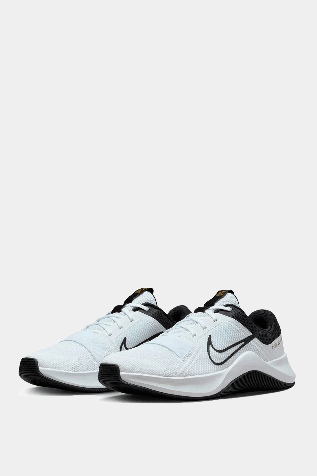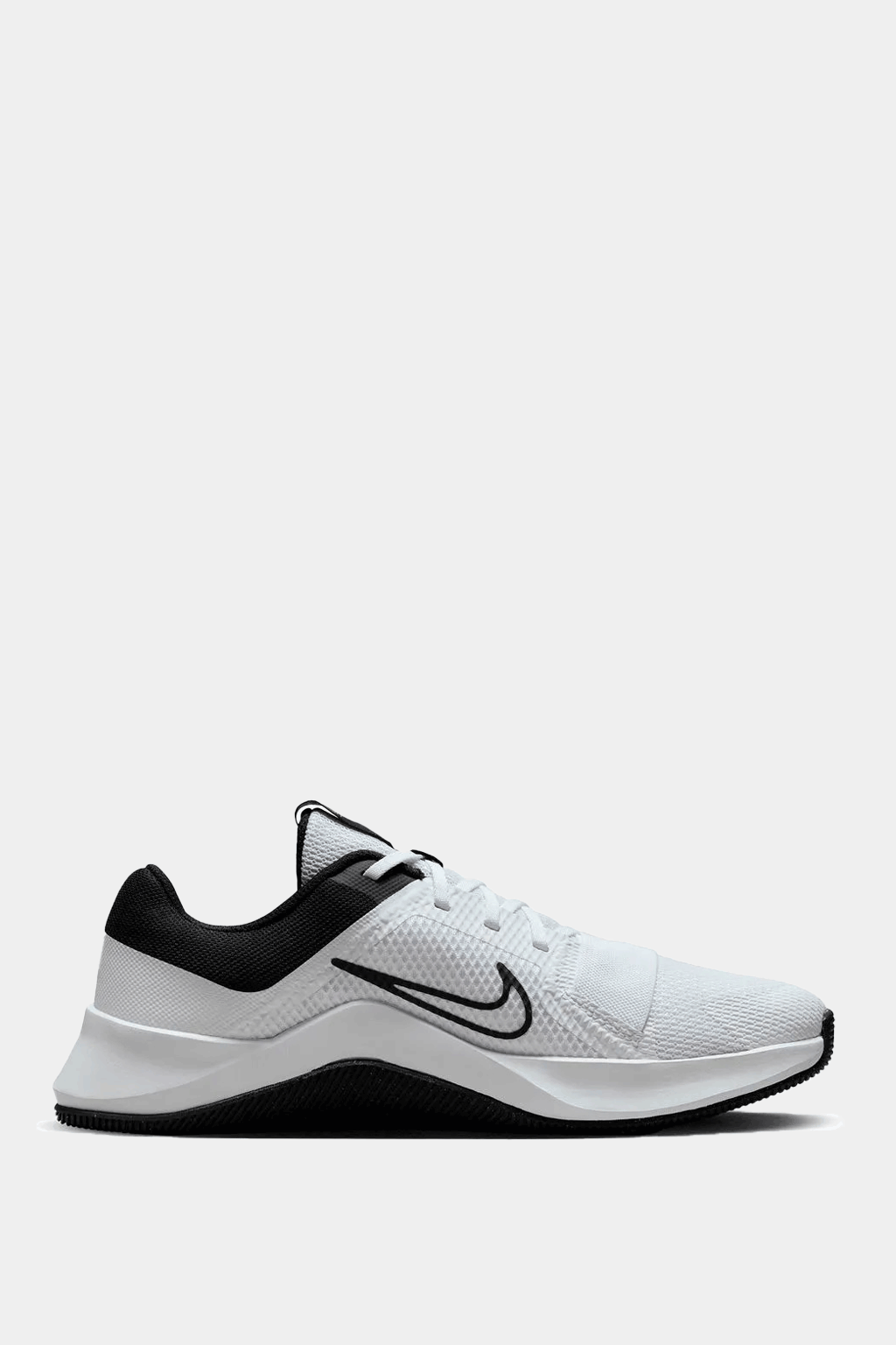 A versatile men's training shoe designed for stability and agility. Features a clean white mesh and leather upper with black heel and midsole accents. The flat, wide base supports weightlifting and cross-training, while flexible forefoot foam enables quick-twitch drills.