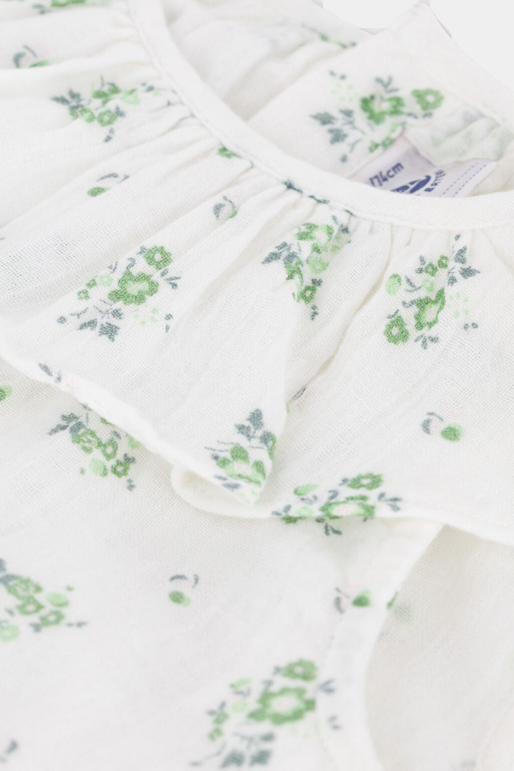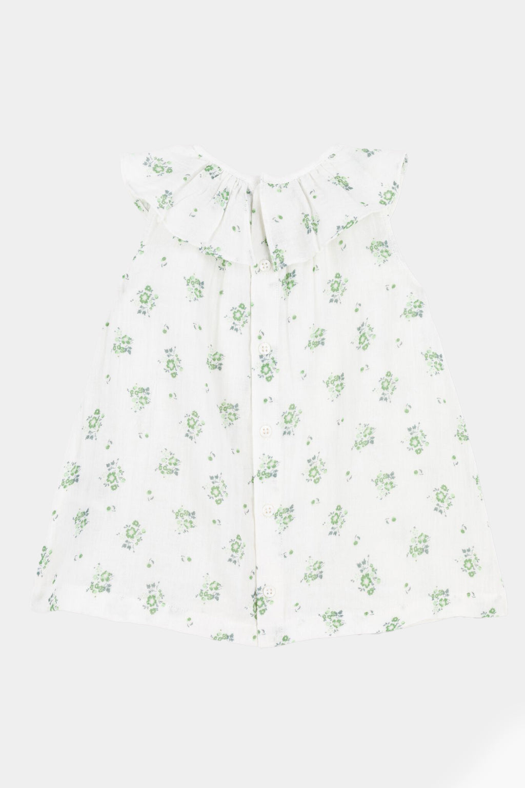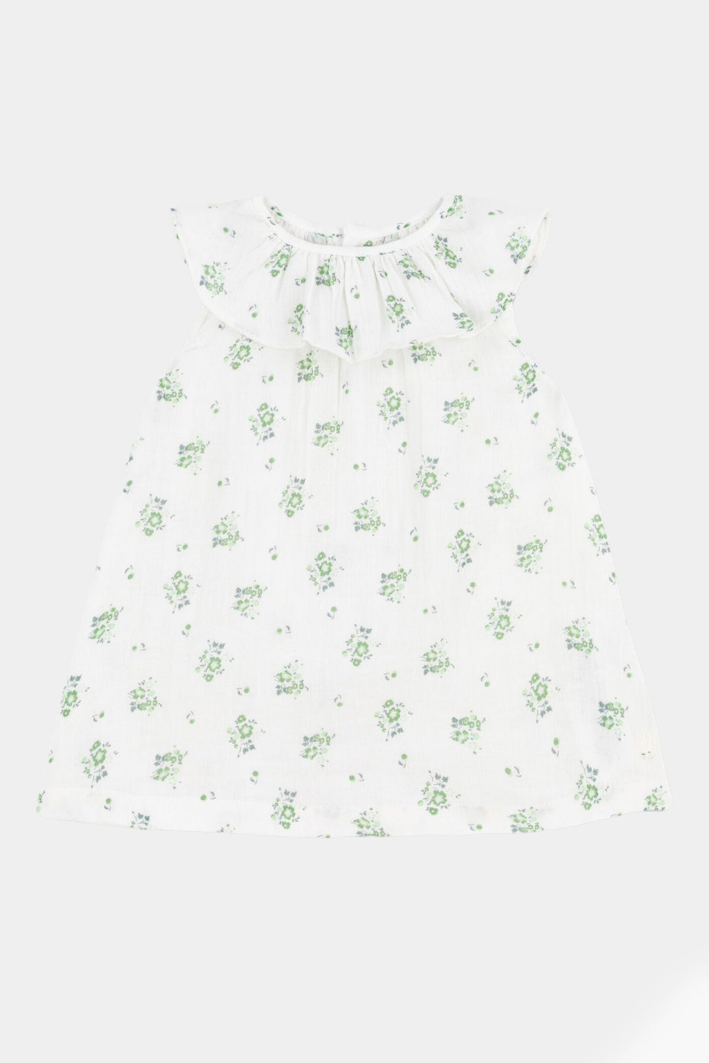 A lovely dress with a flower print. Tubic material with a gauze-like texture woven from two pieces of fabric provides a comfortable fit. The frilled collar is the point of the design. The back opens wide, making it easy to change clothes and diapers. It is an eco-friendly item that uses organic cotton.