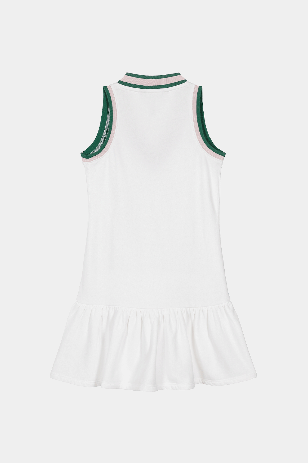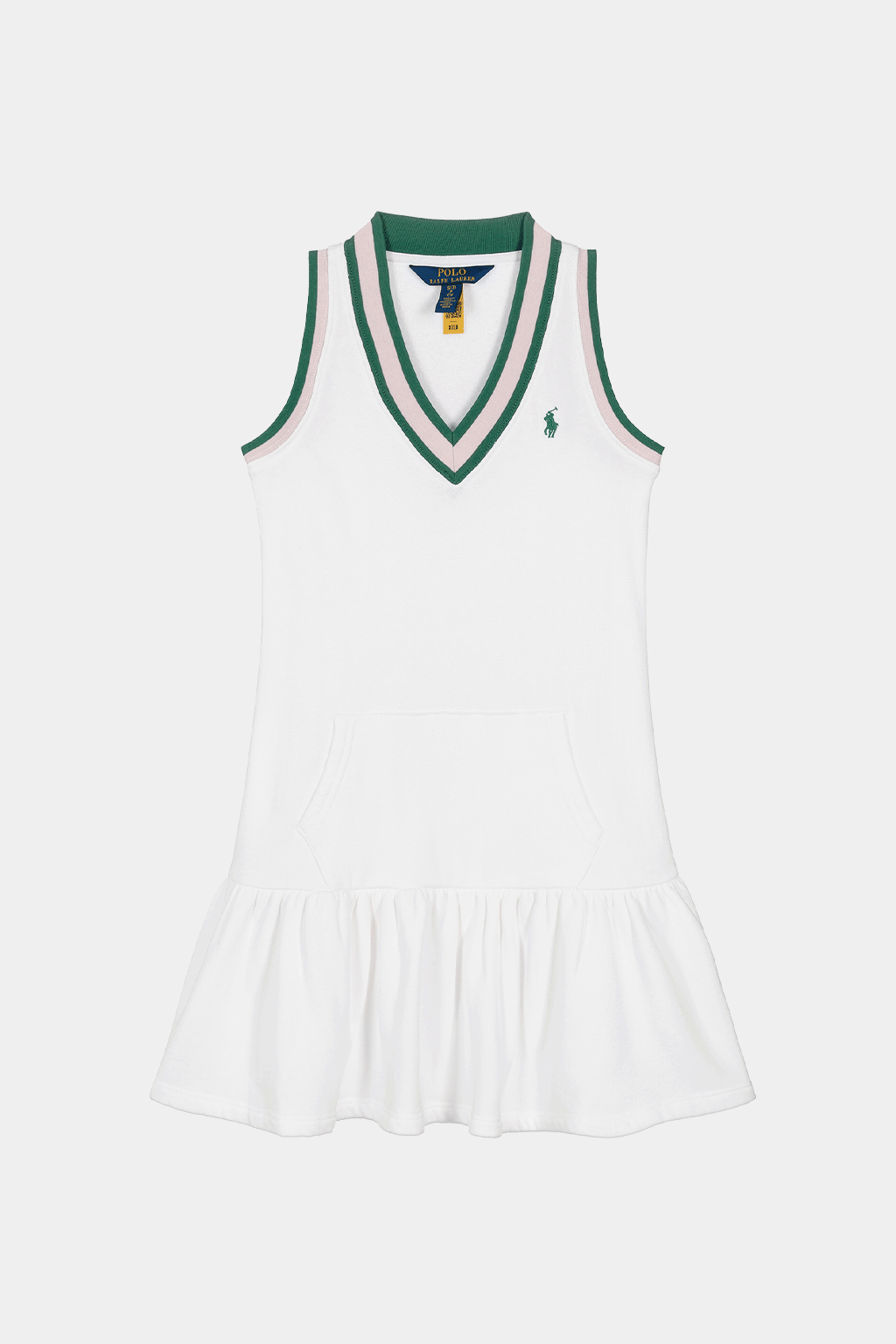 Elevate your little one‚ as wardrobe with the Polo Ralph Lauren Girls' White Cotton Tennis Dress. Crafted from soft cotton jersey with a cozy toweling inside, this sporty dress features vibrant green and pink ribbed trims and the iconic pony logo embroidered on the front. With a convenient pouch pocket and a gathered skirt, it combines style and practicality. Easy to wear, it slips on effortlessly over the head for a look.