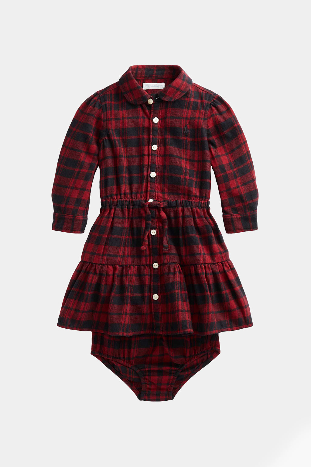 This twill shirtdress in classic fit-and-flare silhouette features a tiered skirt, a bold plaid print, and long sleeves with buttoned barrel cuffs.