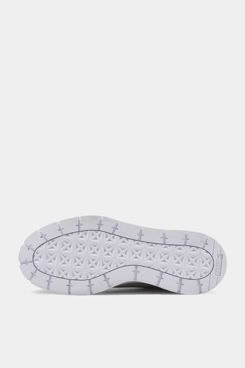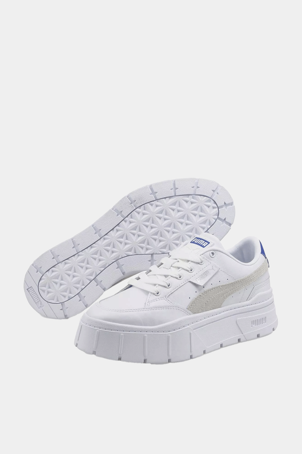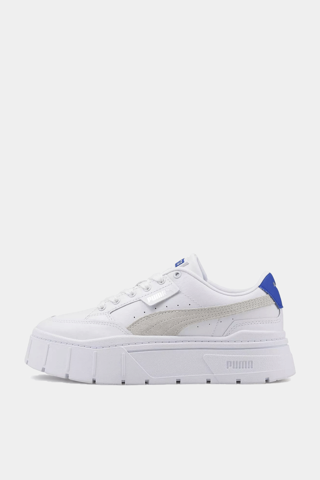 PUMA Mayze Stack WNS is a bold women's platform sneaker that blends street style with sporty flair. Featuring a clean white leather upper with subtle suede overlays and a striking royal sapphire heel accent, it sits on an elevated rubber sole for added height and attitude. Perfect for making a statement with everyday looks.