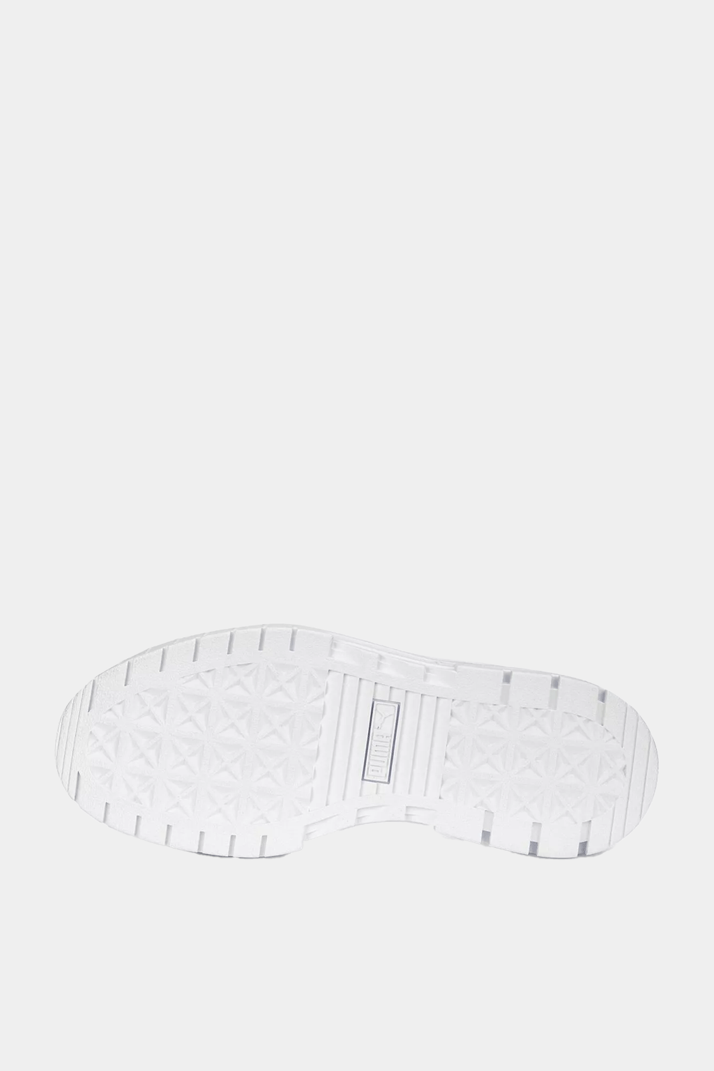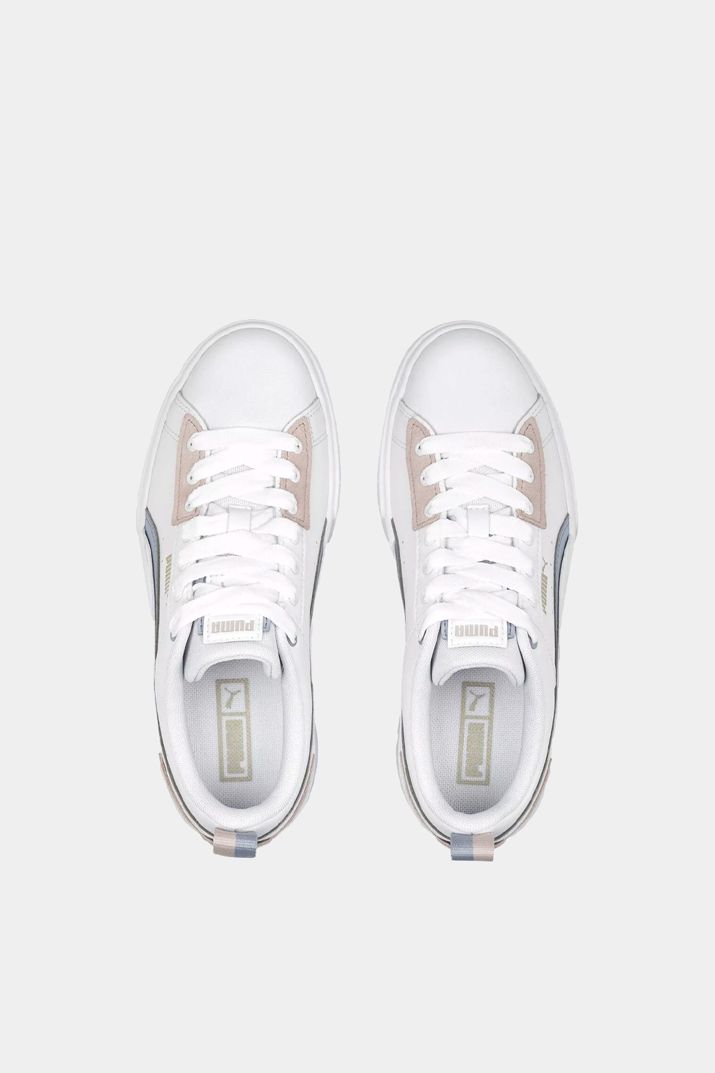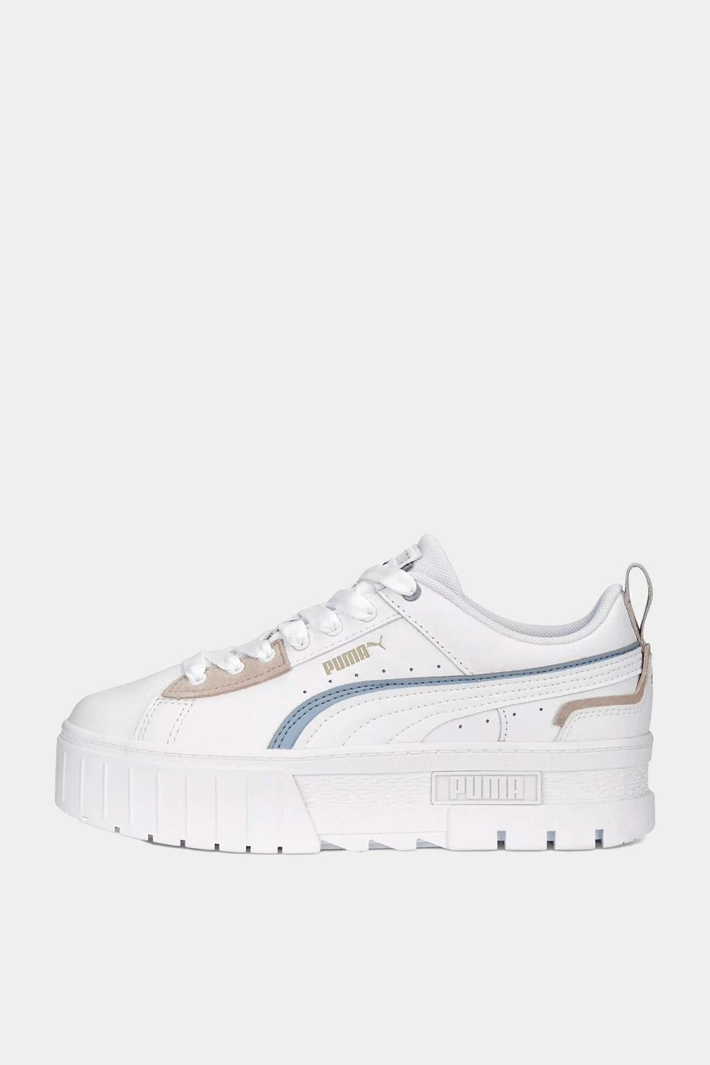 A fashion-forward women's platform sneaker featuring a sleek white leather upper with suede and synthetic overlays. It sits atop a stacked EVA midsole and chunky rubber outsole, offering height, style, and street-ready flair. Released April 6, 2023 under PUMA's Mayze line