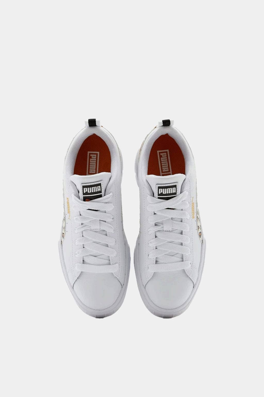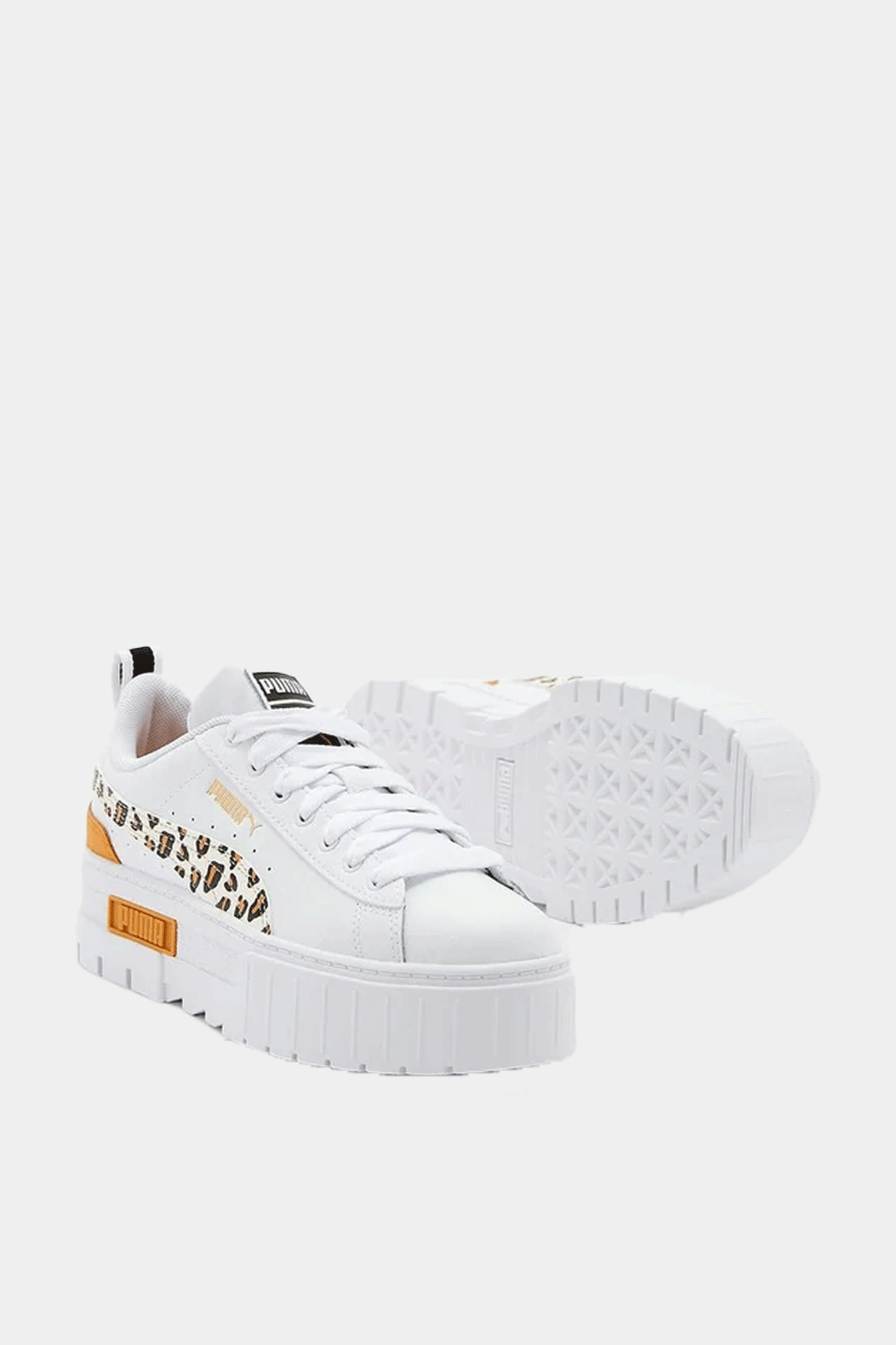 PUMA Mayze Wild JR is a bold and trendy sneaker designed for young fashion enthusiasts. It features a stacked sole for extra attitude, a white synthetic leather upper, and playful leopard-print accents on the PUMA Formstrip. With its chunky silhouette and eye-catching details, it's perfect for kids who love to stand out in style.