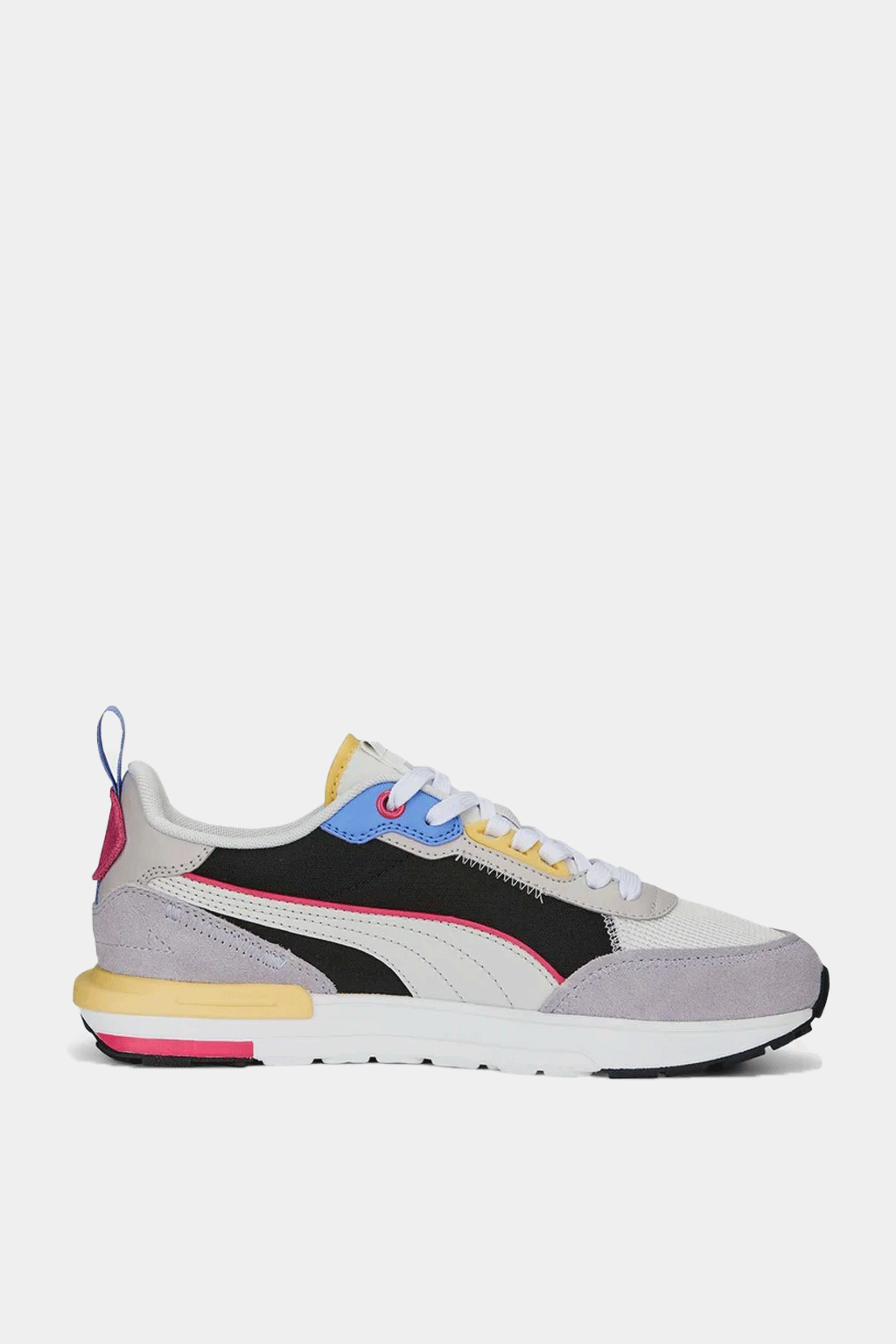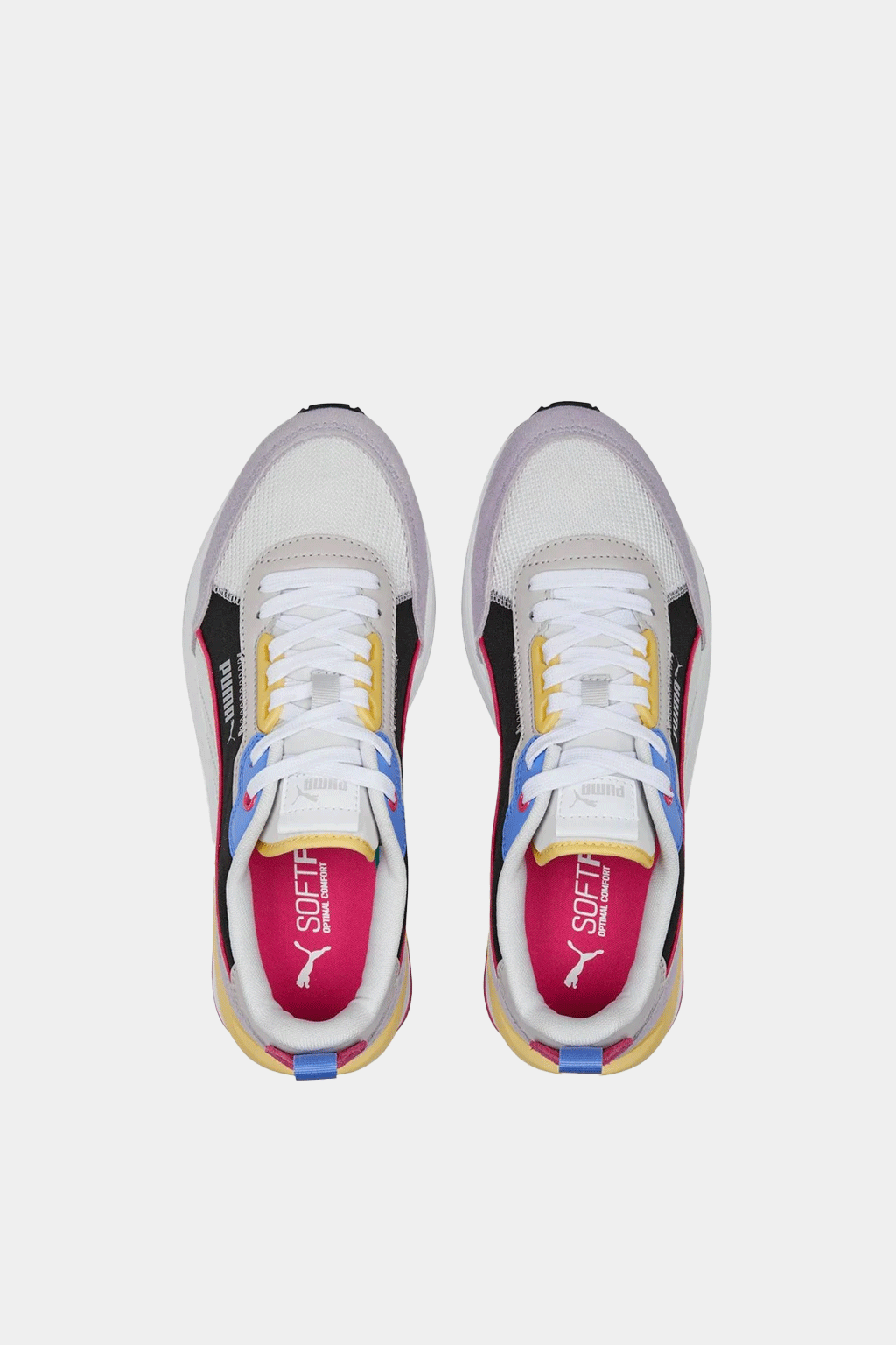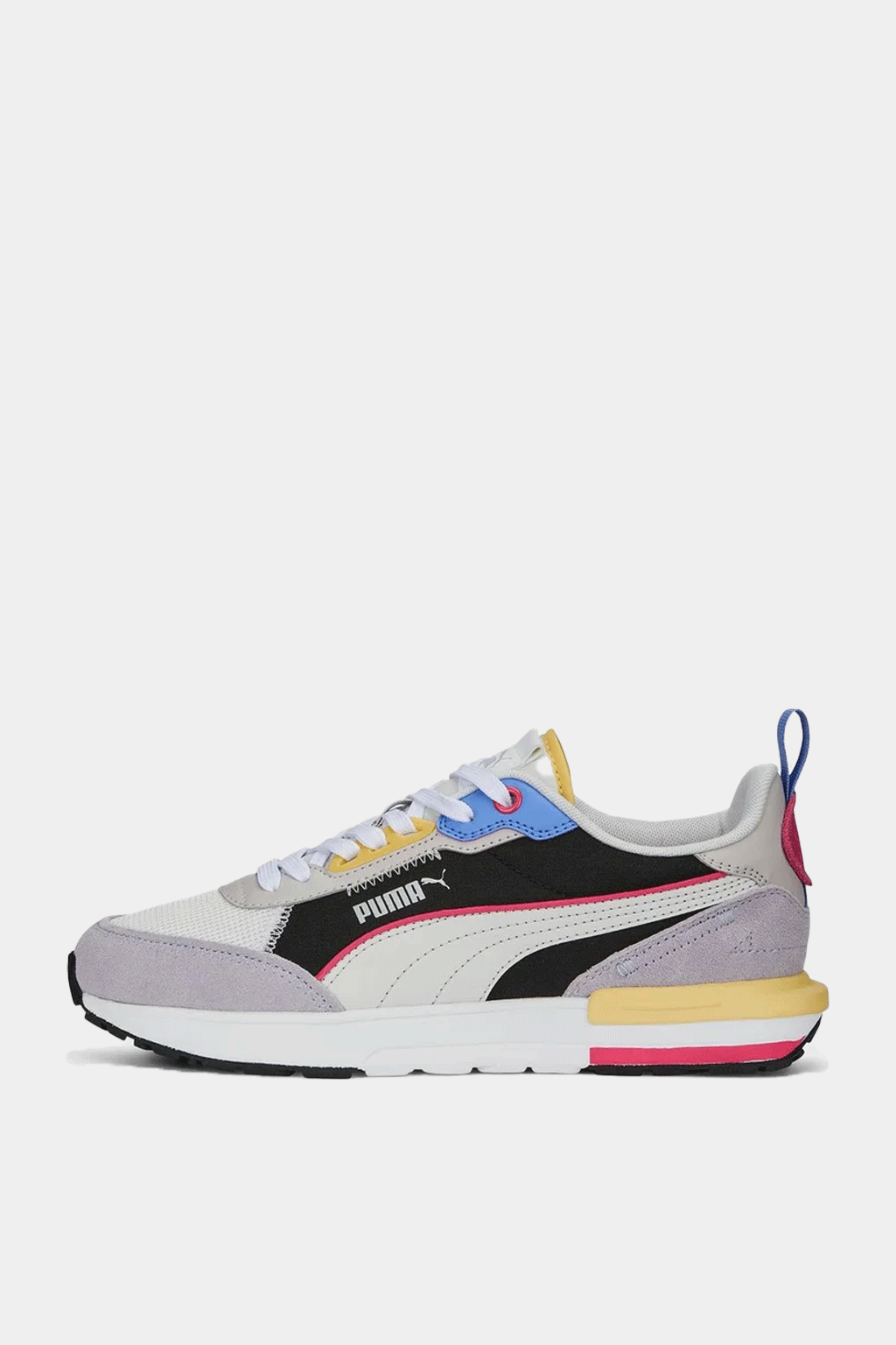 The R22 is a futuristic reinterpretation of Puma's classic running silhouette. This colorway combines a corduroy and textile upper with synthetic overlays, giving it a layered, tech-inspired aesthetic. A chunky CMEVA midsole, complete with a TPU clip at the heel, adds structure and youthful flair. The looped heel tab and vibrant accents enhance its modern, street-ready vibe.