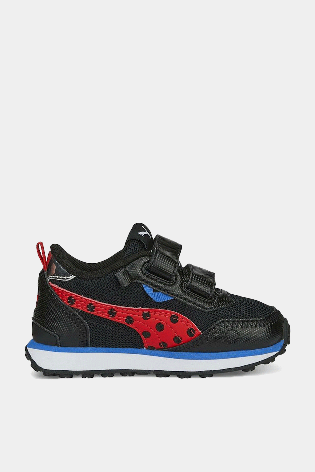 The PUMA Rider FV Miraculous V INF is a fun and stylish sneaker for infants, inspired by¬¨‚ †Miraculous: Tales of Ladybug & Cat Noir. It features a breathable black mesh upper with bold red polka-dot details, a cushioned EVA midsole for all-day comfort, and a convenient hook-and-loop strap for easy wear. Designed for little adventurers with big imaginations.