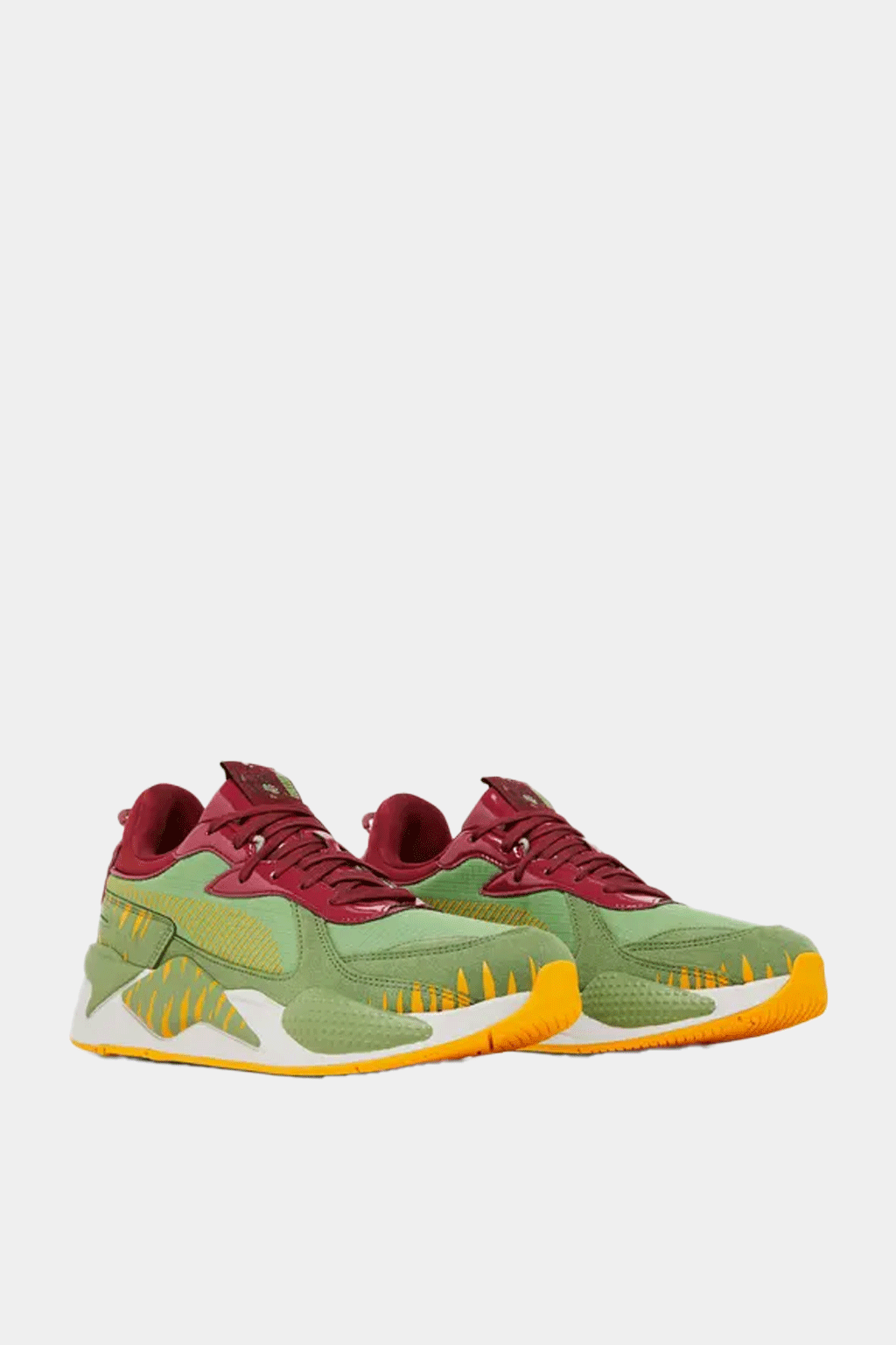 The RS X Battle Cat is a bold mash-up celebrating Masters of the Universe, inspired by He-Man's iconic feline ally. It features a vibrant olive-green textile upper accented with fiery russet overlays and saffron yellow hits. The chunky RS X outsole integrates graphic elements‚ reminiscent of Battle Cat's tiger stripes‚ on a sculpted midsole. Subtle nods to the character, like a shield emblem on the heel, give it a collectible edge.