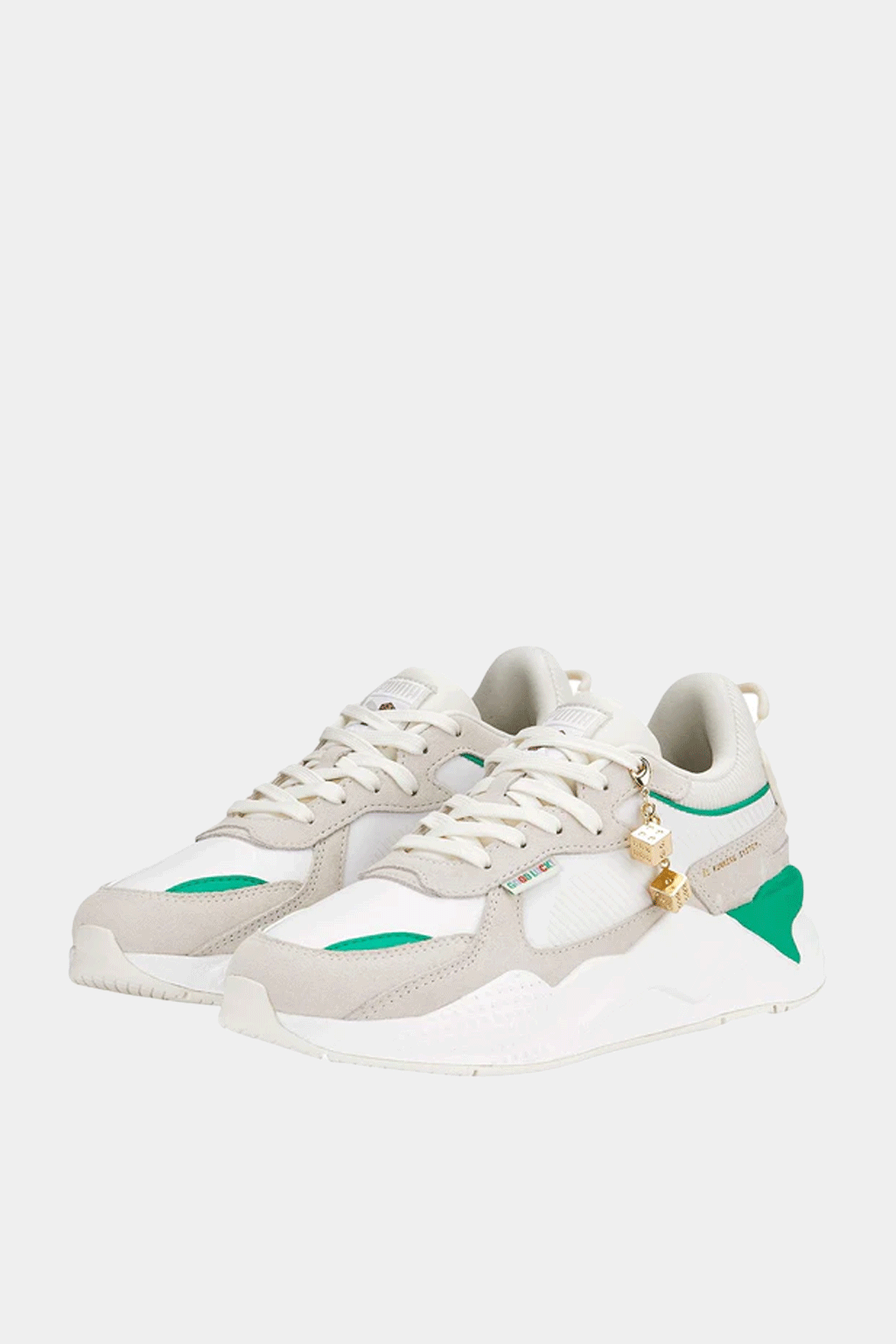 The PUMA RS-X Lucky Charm WNS is a bold women's sneaker that blends retro design with modern flair. Featuring a white leather upper with warm white overlays and grassy green accents, it's inspired by good luck symbols and charm aesthetics. Built on the signature RS cushioning, it offers comfort with a unique, statement-making style.