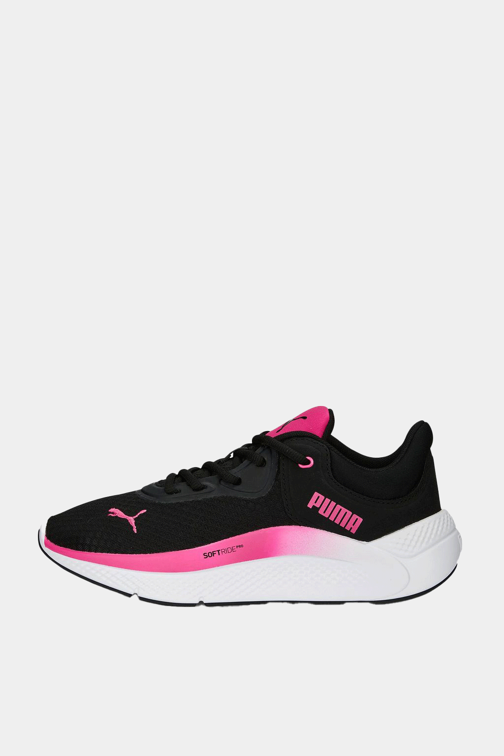 The Puma Softride Pro WNS is a women's running shoe designed for comfort and style. This model features a sleek black upper with subtle pink accents, making it suitable for both workouts and casual wear.