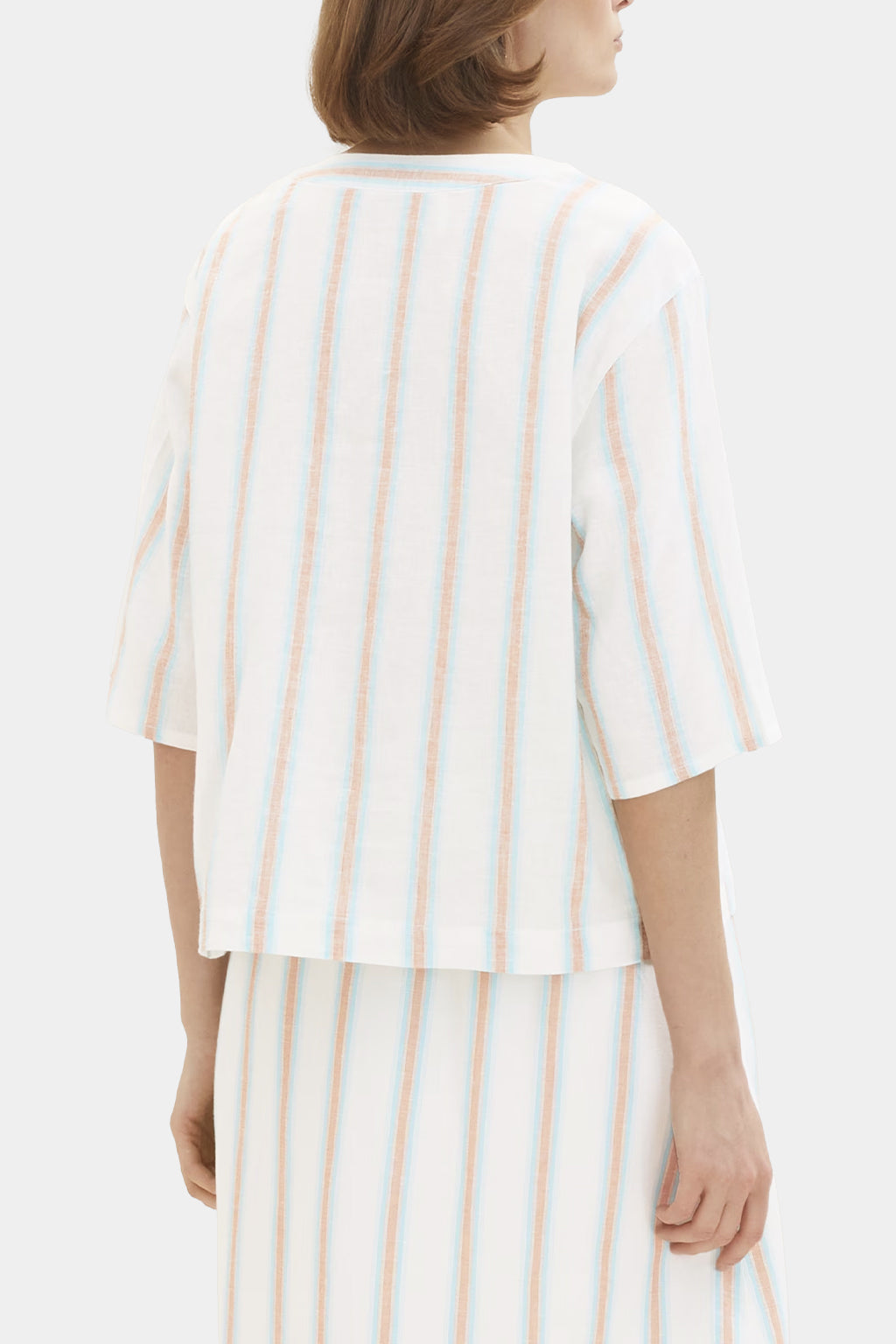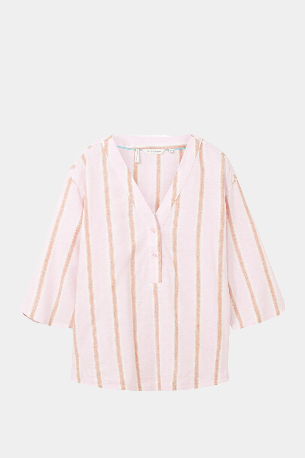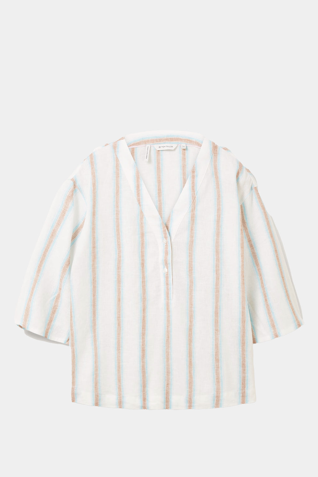Expertly crafted from a lightweight linen mix, the Tom Tailor Blouse Tunic exudes effortless style. Featuring a classic loose fit, 3/4 sleeves, and a button placket V-neck, this versatile piece is perfect for all occasions. Available in both solid colors and striped designs.