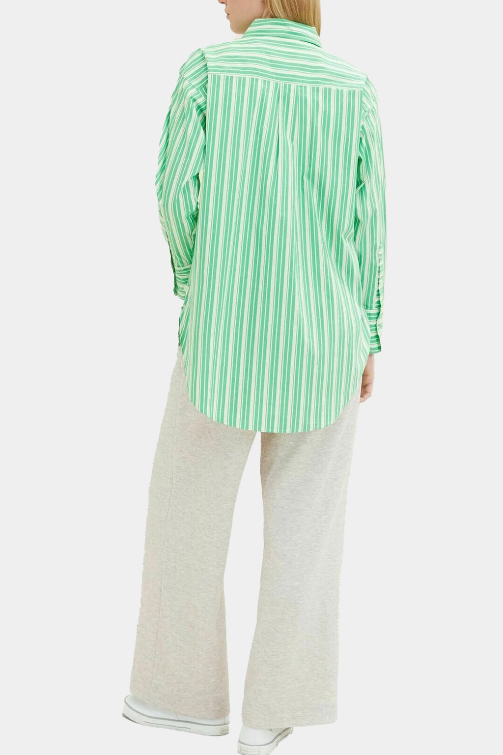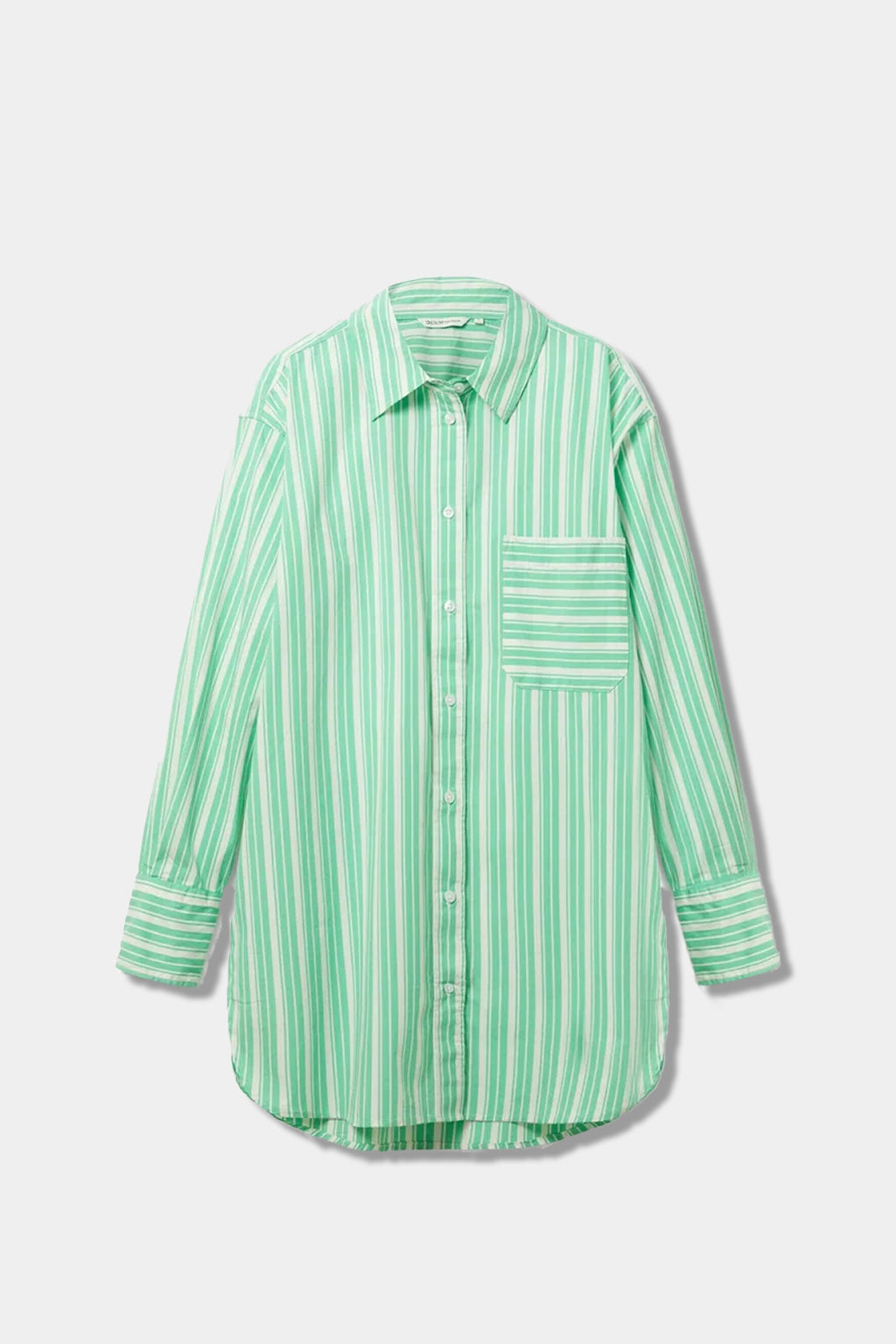 Experience ultimate comfort and style with our Tom Tailor - Long Shirt. Made from high-quality poplin, this blouse features a chest pocket and overcut sleeves for a loose fit. The wide cuff on the sleeve and the pleat detail on the back add a touch of elegance to this versatile piece. Perfect for any occasion.