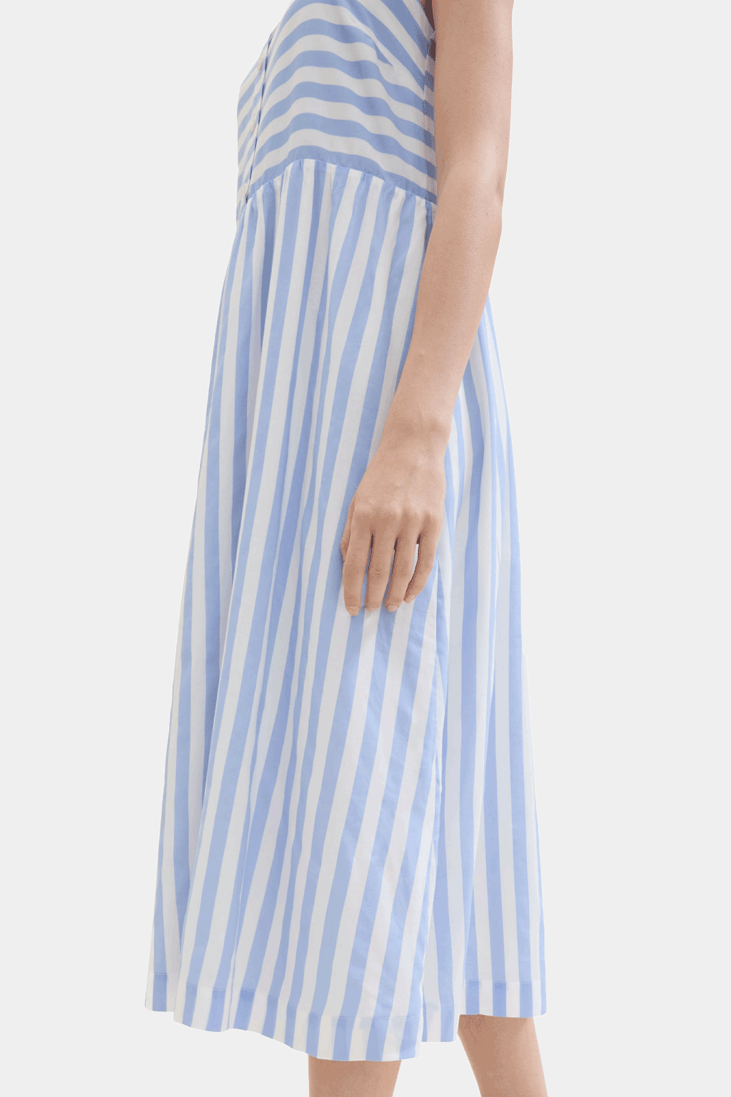 This Tom Tailor Midi Dress in blue and white features a stylish flared fit and a short button placket at the front, adding a touch of casual elegance. Crafted with modal, it offers a light, pleasant feeling on the skin, perfect for everyday wear. The dress combines comfort and style, making it an ideal choice for any occasion. Update your wardrobe with this versatile and chic midi dress.