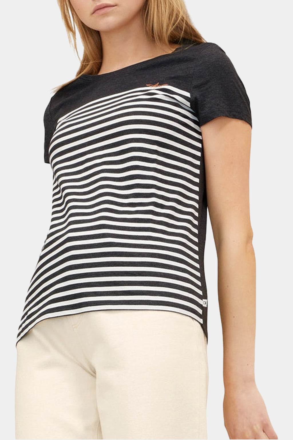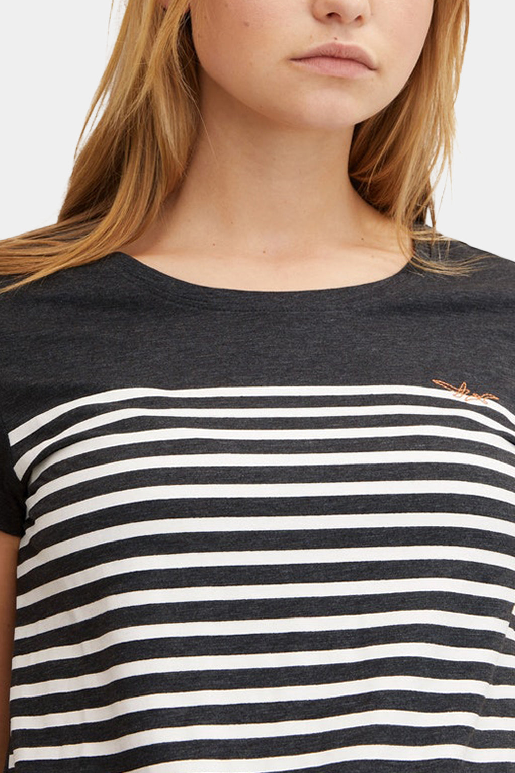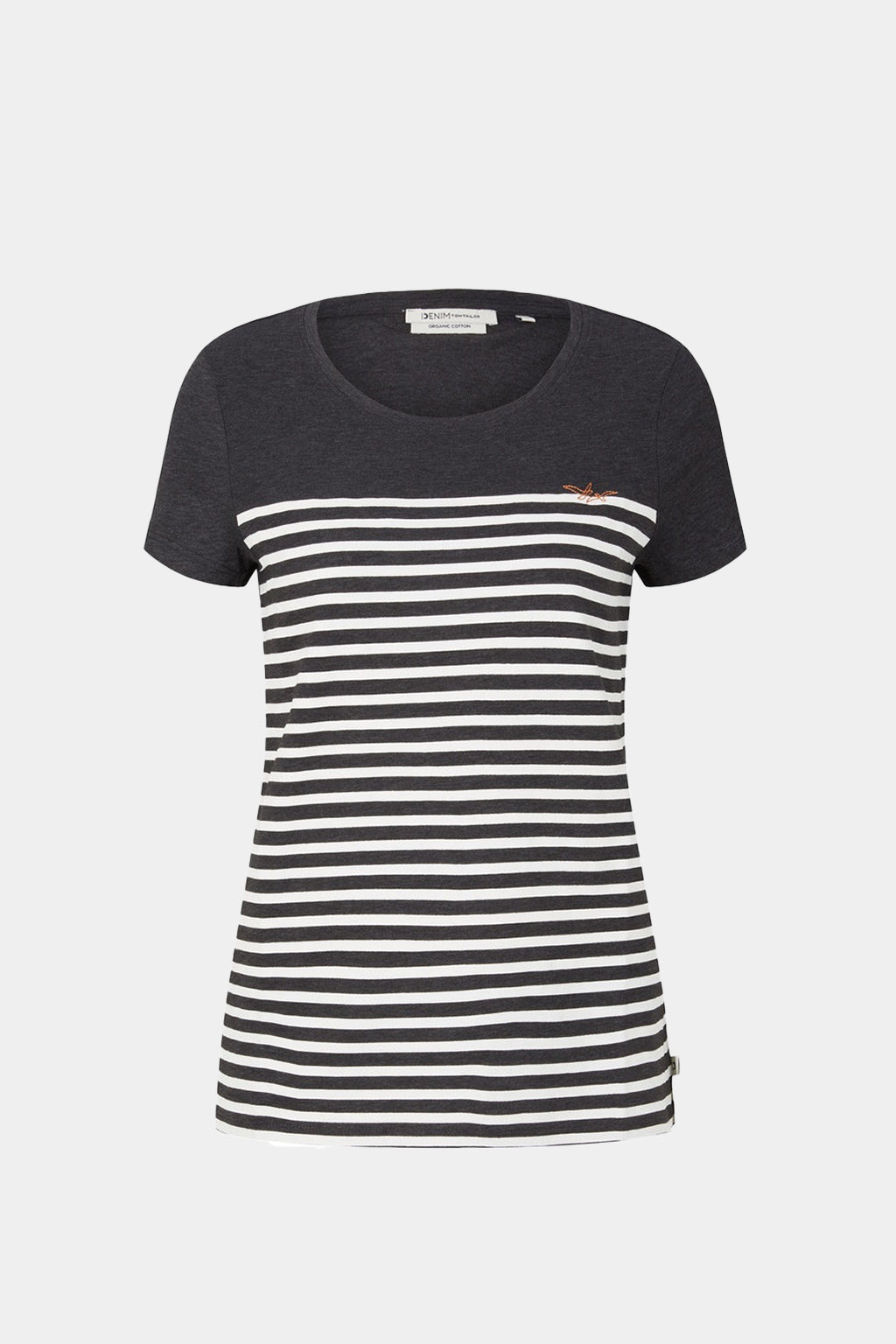 Expertly crafted for a stylish and comfortable look, this Tom Tailor Women's Denim T-shirt features a classic striped design with a unique bird embroidery on the chest. The short sleeves and crew neck provide a casual yet sophisticated appeal. Elevate your wardrobe with this must-have piece.