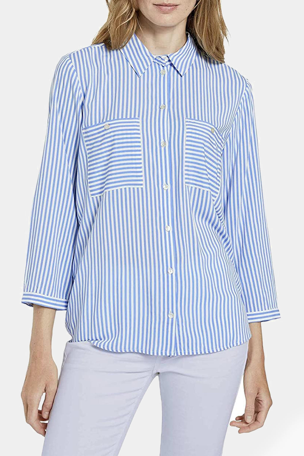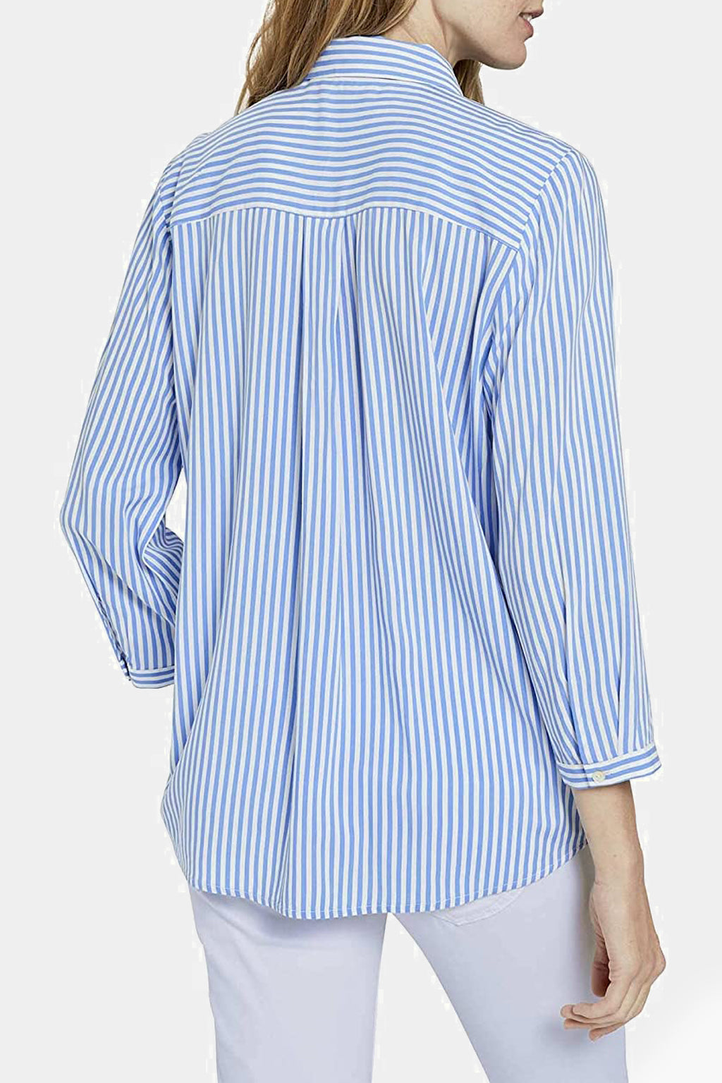 This is a simple and sophisticated blouse. The vertical stripes are a fun detail, and the v-neckline is flattering on all body types. The viscose fabric is soft and comfortable. This blouse is perfect for pairing with any skirt or pair of pants.
