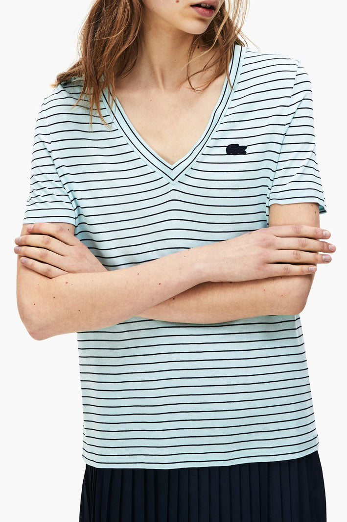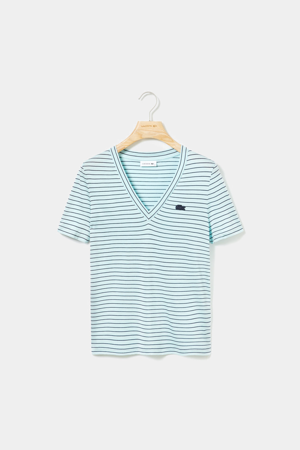 Add a fresh touch to your casual wardrobe with the Lacoste Women's V-Neck Striped Cotton T-Shirt. Made from soft, breathable cotton, it features a flattering V-neckline and timeless stripe design. Finished with the signature embroidered crocodile, this everyday essential blends comfort and iconic Lacoste style effortlessly.