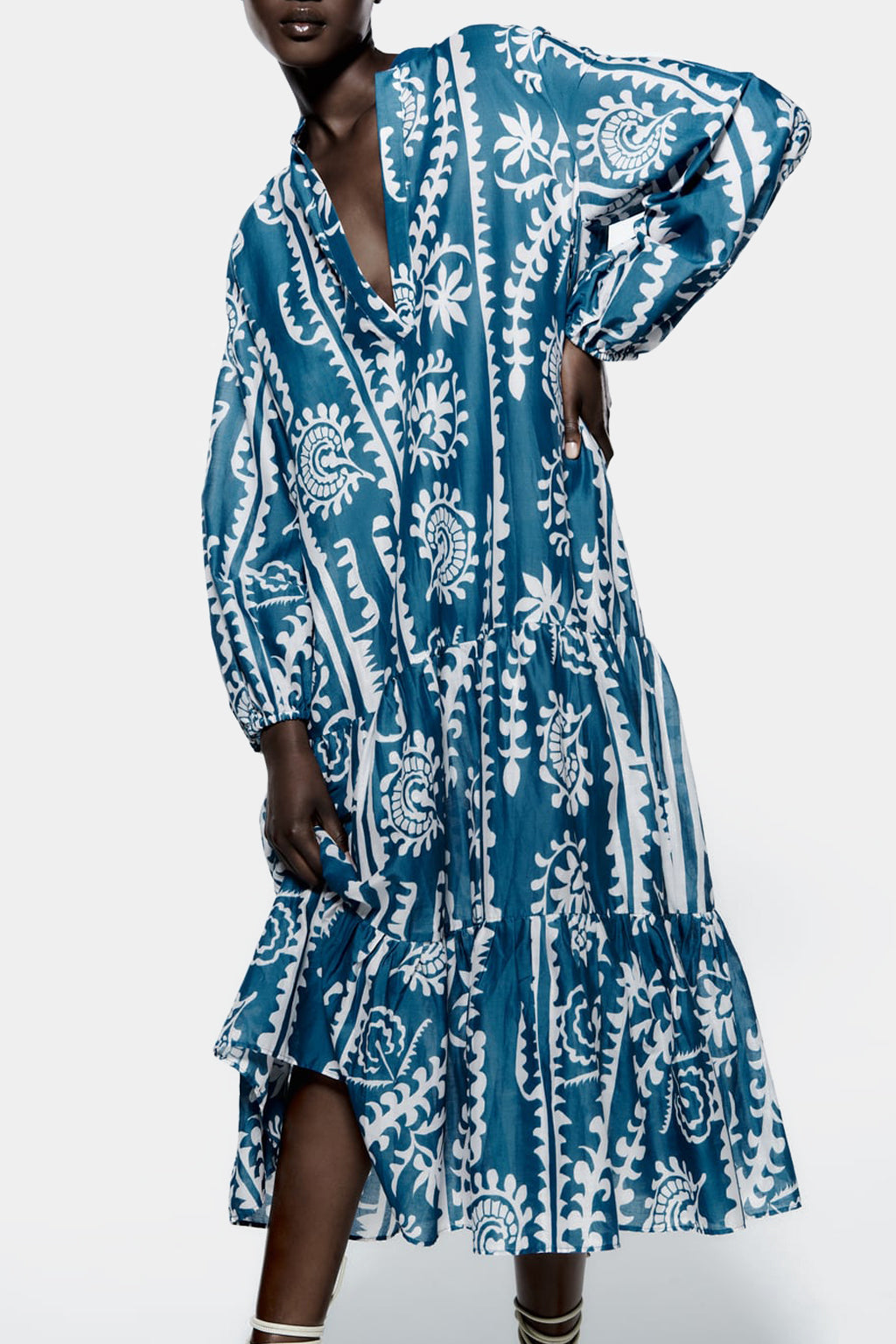 Midi dress featuring a slot collar, long sleeves with elastic cuffs and a panelled hem.